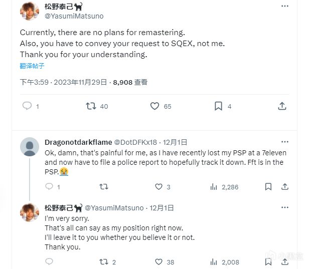 制作人 松野泰己 最近与玩家互动时表示,他们没有复刻《最终幻想战略版》的计划,玩家需要反映给SE而不是他。