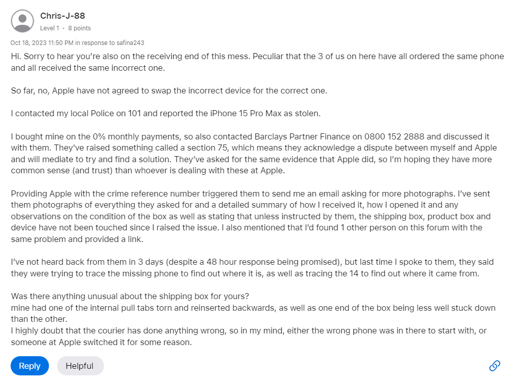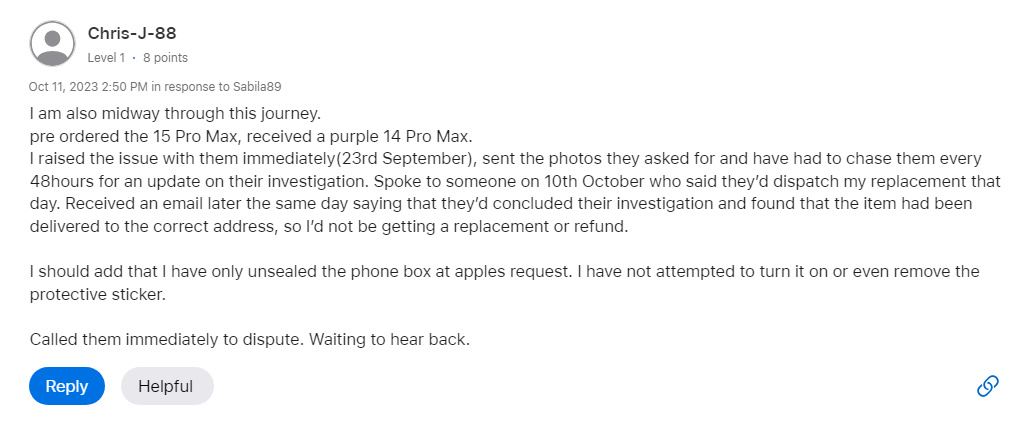 但这个事情并未就此结束,网友 Sabila89 在苹果官方社区发帖,表示从英国苹果官网订购了 2 台iPhone 15Pro Max,结果收到的是iPhone 14 Pro Max,且屏蔽了 IMEI 号,官方不支持退款。
