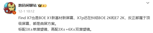 12 月 2 日消息,據數碼博主 數碼閒聊站 爆料,OPPO Find X7 將採用京東方 X1 新基材曲屏幕,而 Pro 版機型還在糾結京東方 2K曲屏 和三星 E7 2K曲屏 方案。