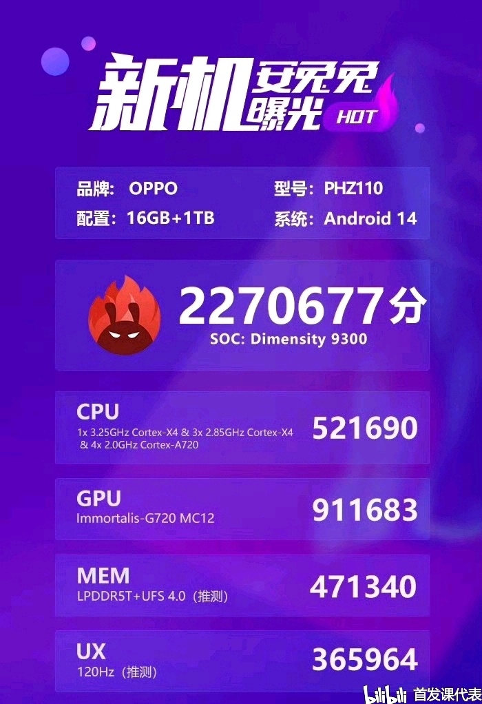 ◆ 安兔兔官方,表示在其後臺中發現了一款搭載天璣 9300 的 OPPO 新機,其型號爲 PHZ110(OPPOFind X7)。