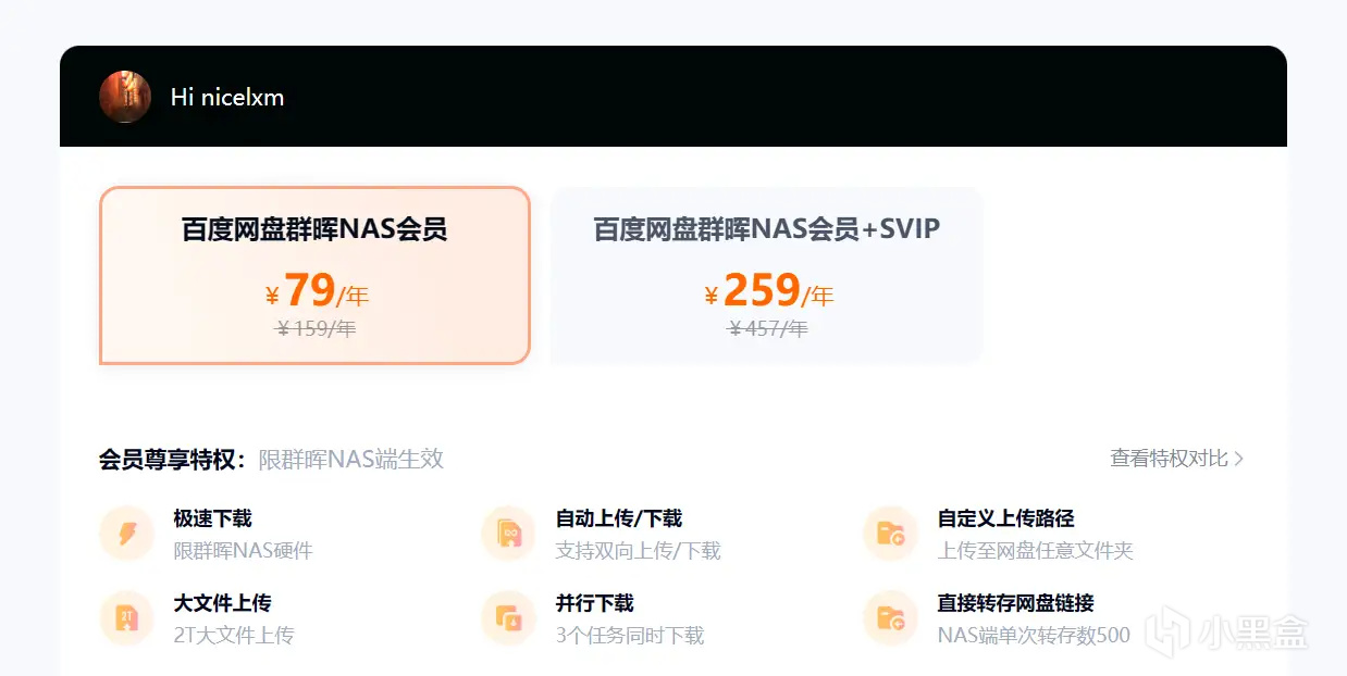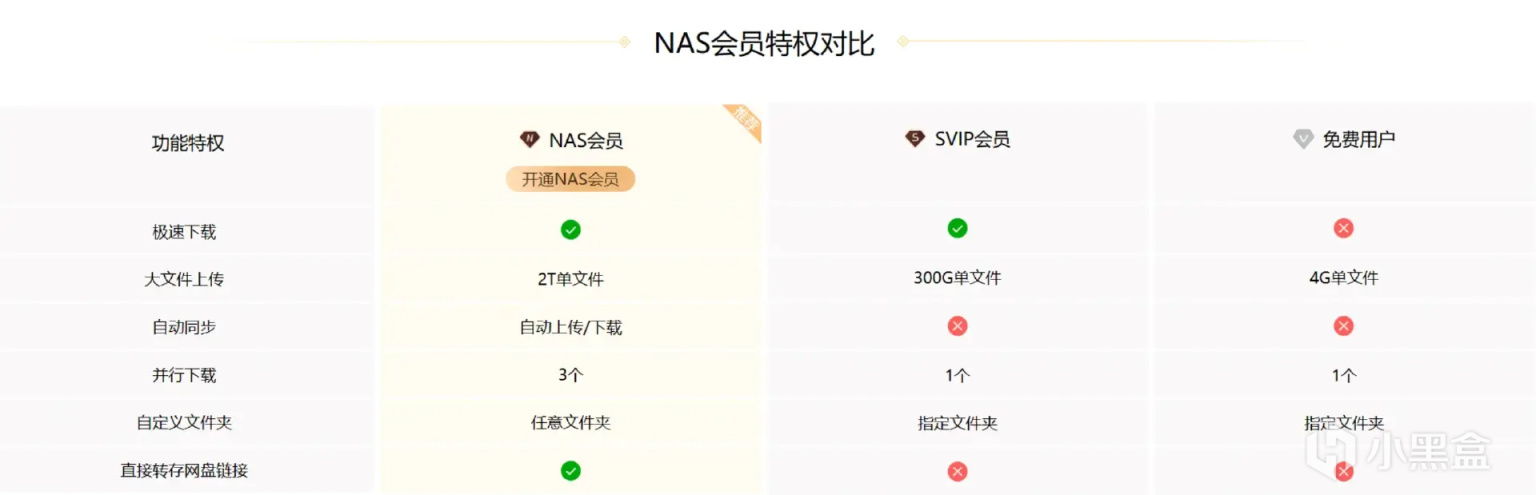 ▼官方還“貼心”的給出了NAS會員、SVIP會員與免費用戶的功能權限對比,簡單來說,如果本身有SVIP,並且不需要同步功能,只是爲了下載分享資源的話,那就不用重新開一個NAS會員,如果本身沒有SVIP,那網盤會員也是有一點點值得買的,畢竟比正經會員便宜很多。