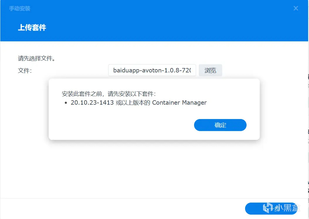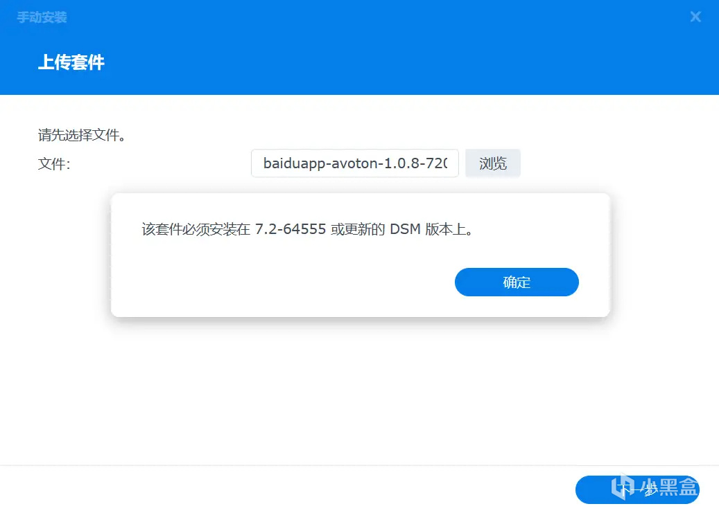 ▼首先想要使用目前最新版本的百度網盤套件,需要DSM 7.2-64555或者更高版本的系統,剛開始的時候打算部署在自己的DSM7.1黑裙上,失敗了。