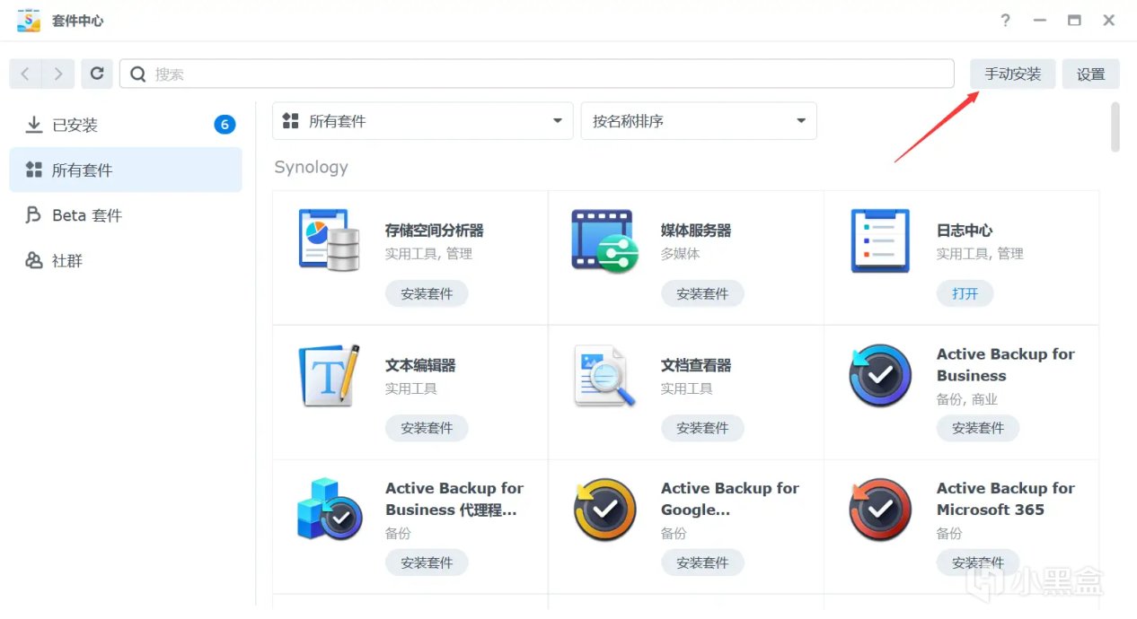 ▼接着在套件中心右上角位置找到手動安裝按鈕。