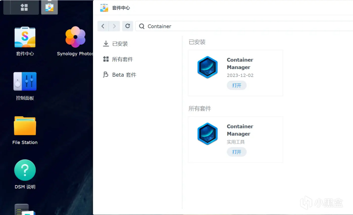 ▼首先打開Web管理界面上的套件中心,搜索Container進行安裝。