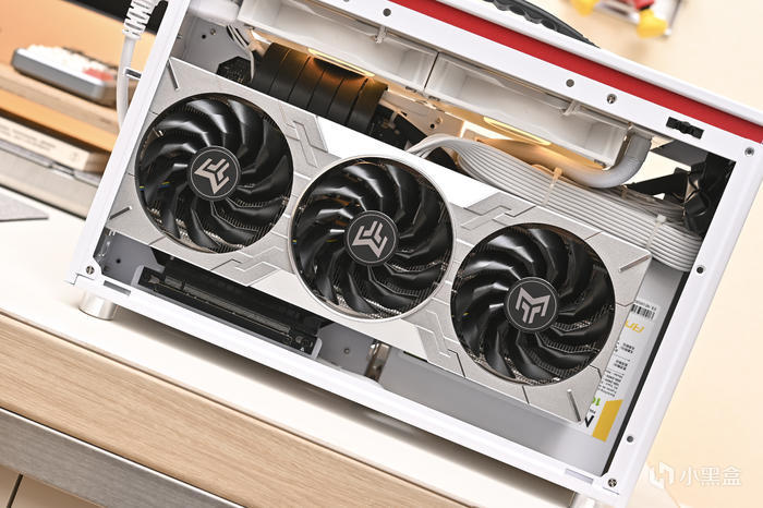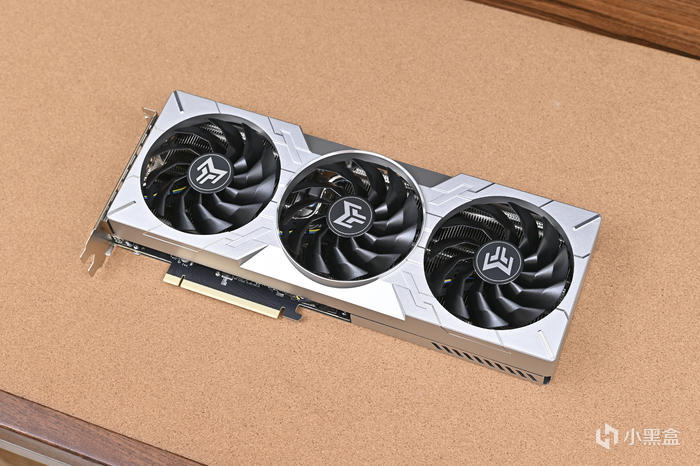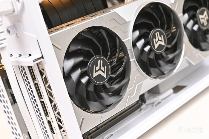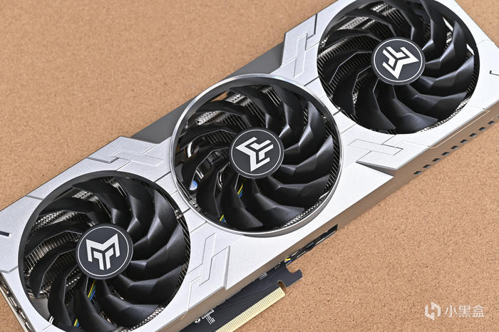 顯卡正面三顆 92mm 特製靜霜風扇,折角扇葉設計,爲散熱模塊提供更強風力和風量保障,加快熱量散熱,此外,風扇均支持智能啓停,靜音的同時延長使用壽命。顯卡外殼邊角處 CNC 高光亮邊極具金屬質感。