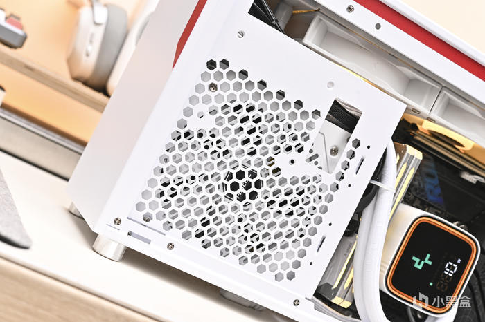 左側爲特色電源倉設計。可安裝 ATX(長度≤140mm)、SFX、SFX-L 電源。上方內部還可安裝 1 個 2.5 寸 SSD。