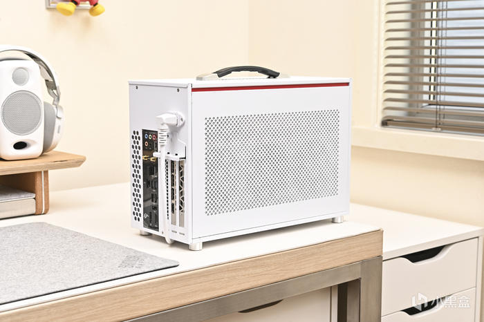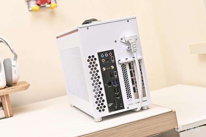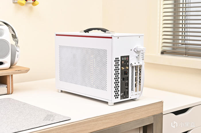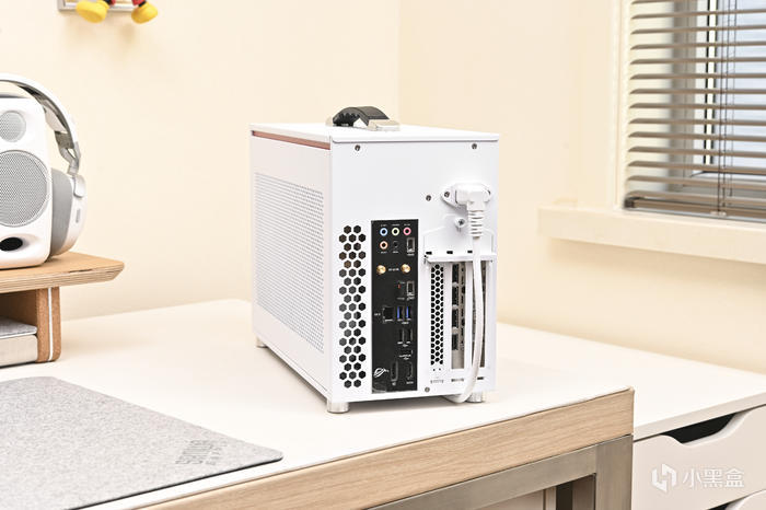 機箱尾部展示。左側通風網孔設計,中央爲主板 I/O 擋板接口,右側上方爲電源轉接線接口,下方爲顯卡接口。