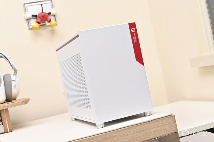 機箱前面板非常簡潔,沒有任何接口,右上角爲紅色裝飾貼紙,印有機械大師 Logo。