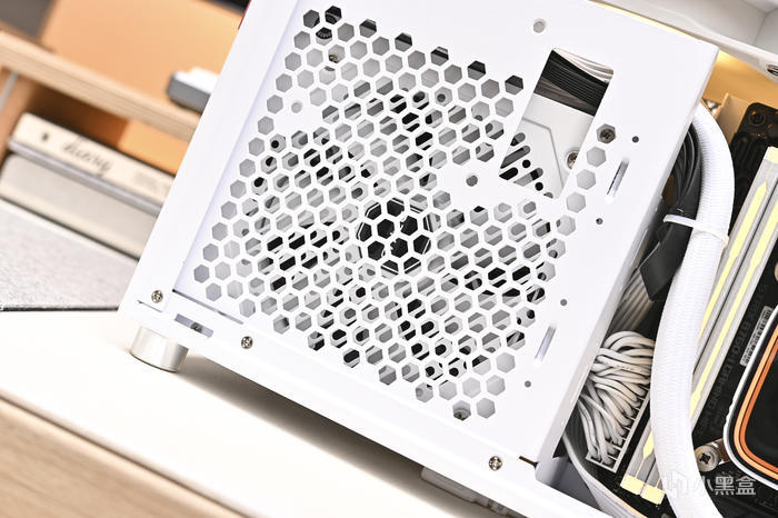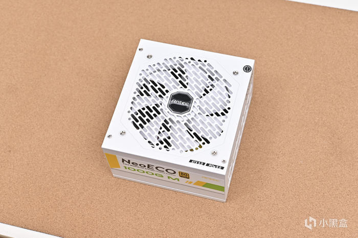 電源通體白色設計,整體尺寸:150*140*86mm,小巧的尺寸緊湊型的機箱,正面爲斜紋鏤空風扇罩,配置了一把 120mm 的 FDB 動壓軸承風扇,支持自動啓停風扇停轉技術,50% 負載下風扇停轉。
