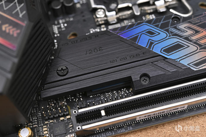 M.2 散熱片表面同樣採用了拼接圖案設計,右側表面爲復古風的幻彩 ROG Strix 裝飾圖案。