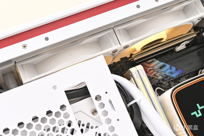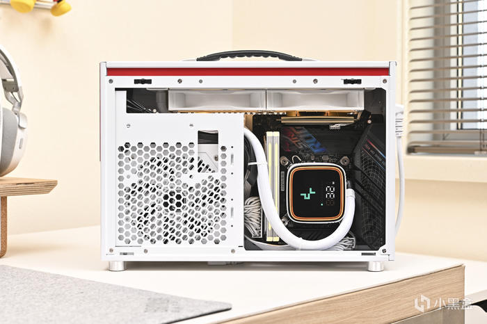 整機採用 ATX 電源+雙槽顯卡安裝方案。整體白色,紅色裝飾條點綴,保留水冷及內存橙黃色 RGB 燈效(R255,G90,B0)點綴。以下爲機箱各角度展示。