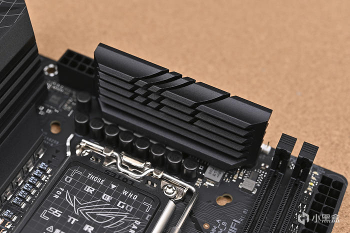 ROG STRIX B760-I Gaming WiFi 主板供電散熱裝甲上的網格風的 ROG LOGO 及 Mini 版的 ROG 標識。
