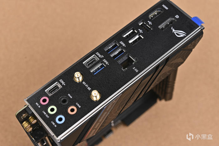 後方 I/O 接口,包括:1x HDMI 2.1、1x DP 1.4、1x USB 3.2 Gen2x2 Type-C、3x USB 3.2 Gen1 Type-A、1x USB 3.2 Gen1 Type-C、1x 2.5Gbps 有線LAN、2x 無線網卡天線接線端、以及 5x 3.5mm的音頻組合輸出。