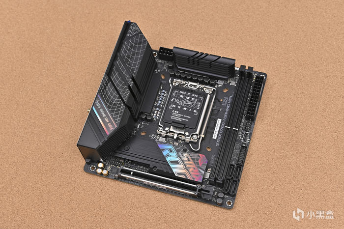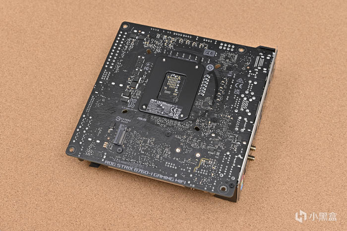 取出主板。ROG Strix B760-I Gaming WiFi 這是一款 ITX 版型主板,採用黑色主色搭配幻彩點綴的炫酷風格。