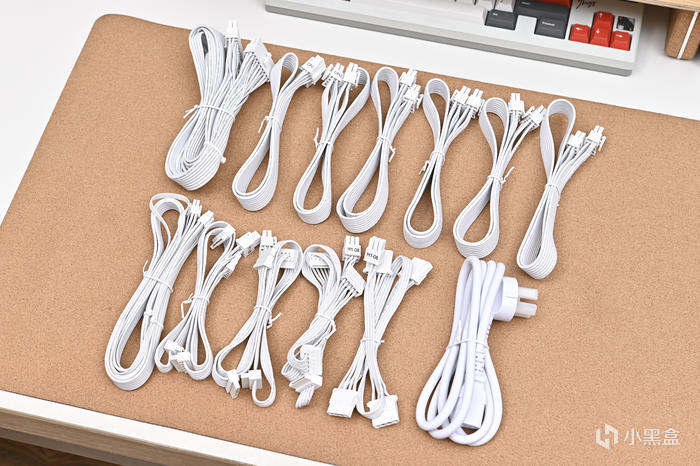 線材方面全部採用白色扁平線設計,方便機箱內部走線。模組線纜共有:1 條 24pin 主板供電線,2 條雙 4+4pin 的 CPU 供電線,4 條 6+2pin 的 PCI-E 供電線,1 條 16Pin PCI-E 5.0 12VHPWR 供電線,3 條 4 口的 SATA 接口供電線,以及 1 條四口大 4PIN 接口。此外,電源線也是附贈的全白色的。