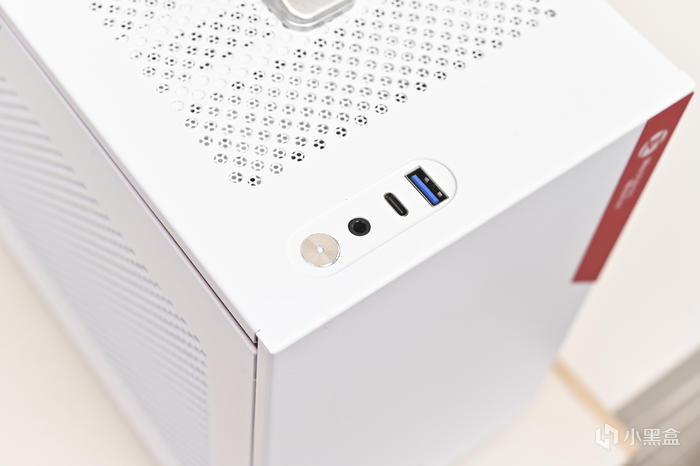 前面板 I/O 接口在左下角,從左到右分別爲:1x 鋁合金材質機箱開關(內置白色 LED 指示燈)、1x 3.5mm 音頻複合接口、1x 10G USB Type-C、1x USB3.0 TypeA。