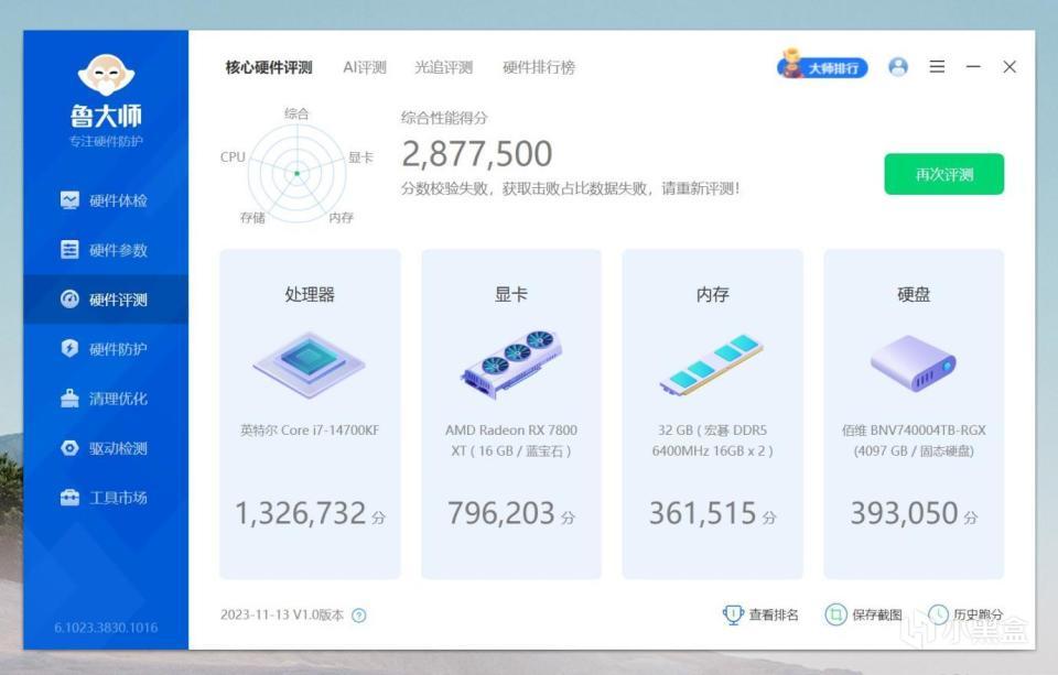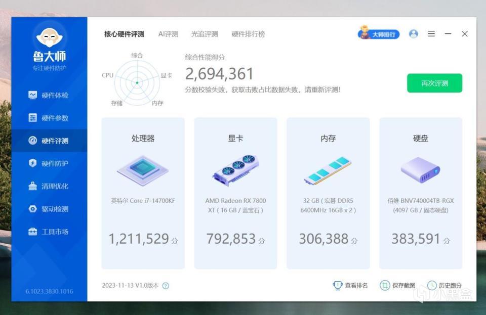 運行下我可愛的魯大師,處理器正確識別是英特爾Core i7-14700KF,內存是宏碁掠奪者DDR5 6400MHz內存 16GB x2,顯卡是藍寶石RX7800XT極光版,主板是微星的MPG Z790 EDGE TI MAX WIFI俗稱刀鋒,顯示器,嗯,後來換了元創師的E27。
