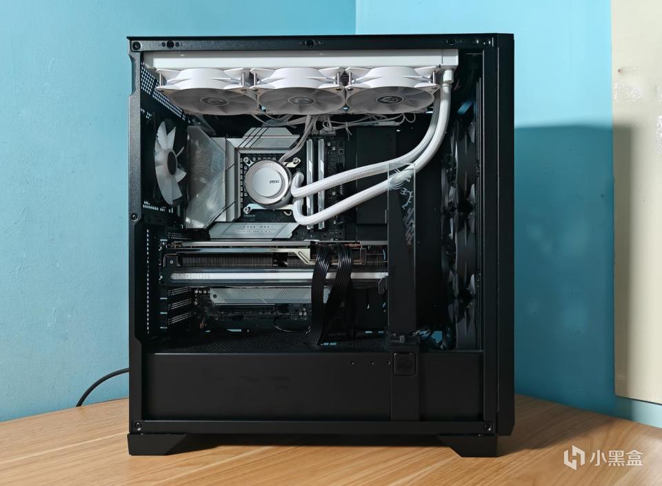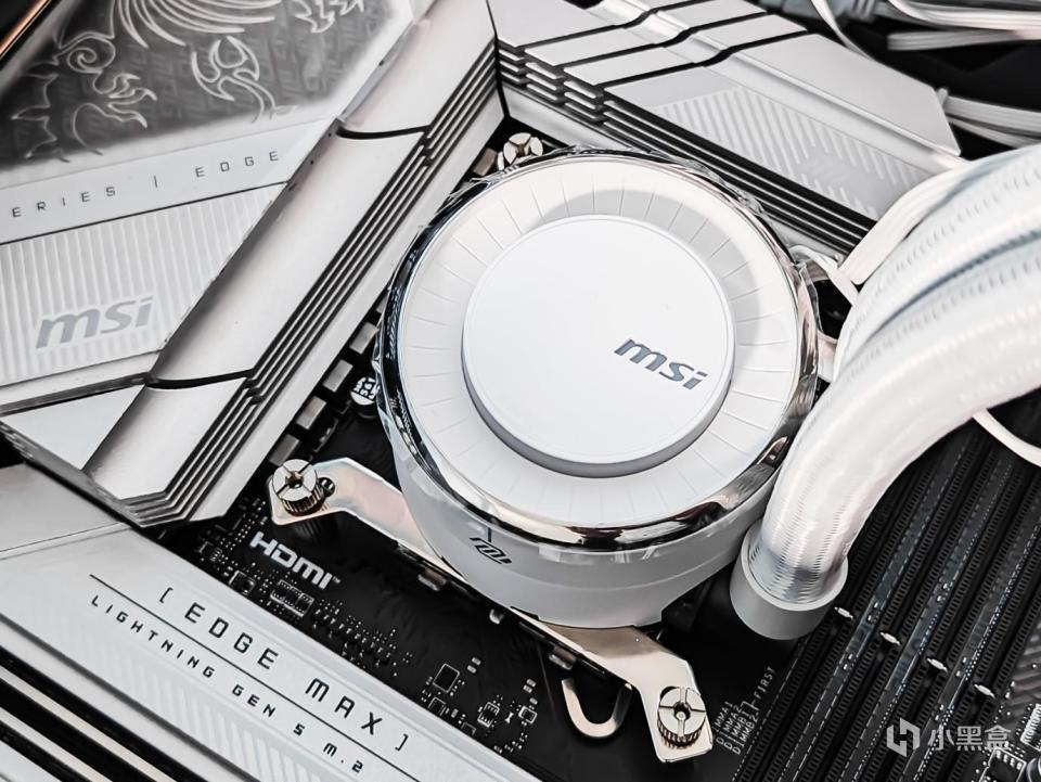 CPU散熱器使用微星的MAG CORELIQUID E360 WHITE 寒冰限定版,這個水冷的冷排、水管、水泵頭的外殼,乃至於線材都是白色的。防蒸發水管,增加了耐用性。冷頭表面是銅製底座,內置高密度水道。風扇葉片的材質是低雜質丙烯酸,質感很好,同時可以獲得良好的ARGB彩光效果。風扇使用了FDB軸承,可以減震減少噪音。