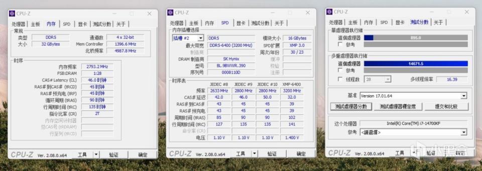內存,採用的是海力士顆粒,默認頻率5600MHz,XMP可達6400MHz,時序32-39-39-102,時序不錯。跑了下分多核14671.5,單核895.0,比較正常。