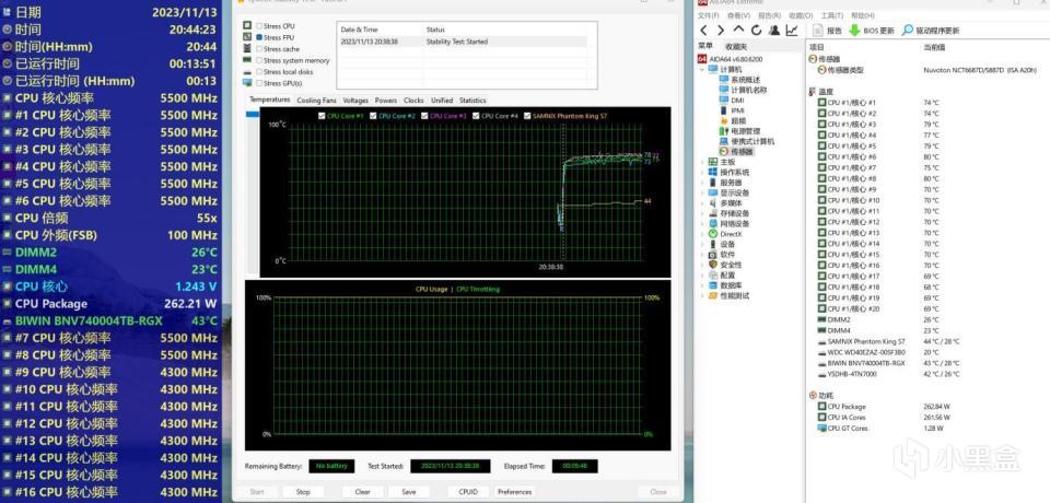 AIDA64 FPU壓力測試,功耗260W,溫度80度,嗯,這個控制住了,不像14900K那樣,瞬間330W溫度100°。
