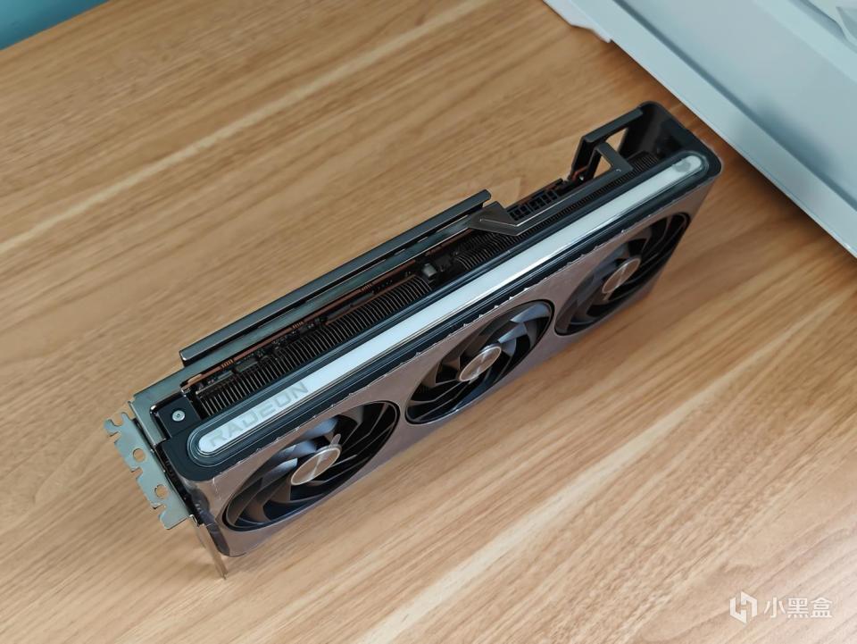顯卡是藍寶石的 7800XT 超白金,黑銀配色外觀,RDNA3架構,加速頻率可以達到2565MHz,配備高達16GB容量GDDR6顯存,顯存速率高達19.5Gbps。外圍是合金加固框,可以加強顯卡結構和耐用性,包裹PCB的側面,同金屬背板形成雙重防護。表面採用了磨砂噴塗,看上去富有金屬質感。顯卡的設計圓潤,看起來比較舒服。