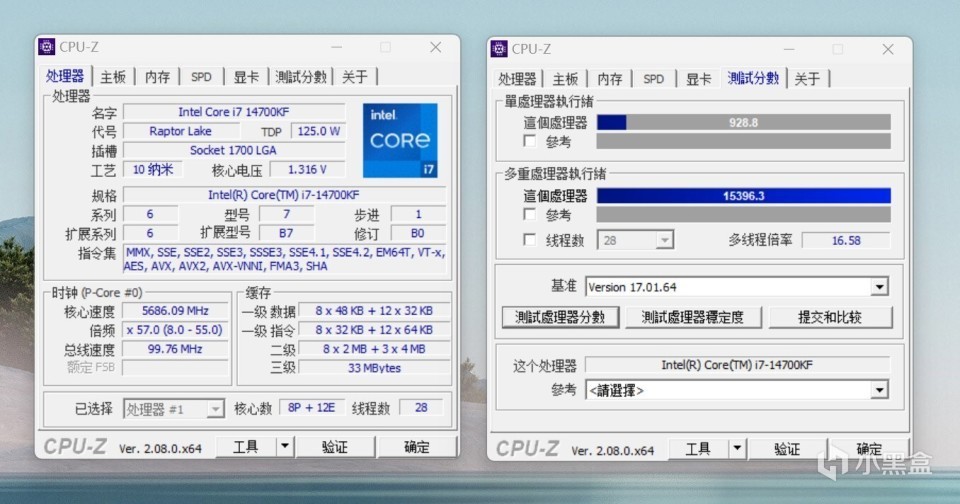 運行CPU-Z,我們看頻率已經上去了,跑下分數,渡河15396.3,單核928.8,比起默頻的多核14671.5,單核895.0,提升了。