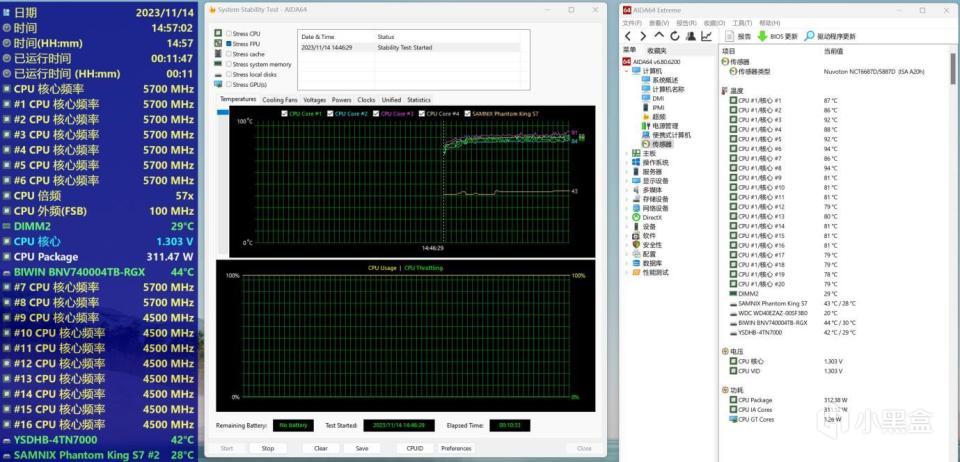 跑下AIDA64 FPU壓力測試,功耗增加到了311W,CPU溫度最後穩定在92度,這個也還可以吧,畢竟我的14900K同樣的頻率已經充到100度了。