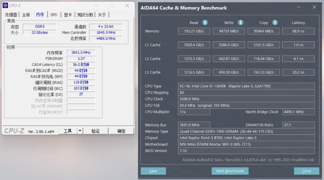 直接用Memory Try it,內存頻率拉到7400MHz,讀取速度爲103.27GB/s,寫入速度爲94759MB/s,複製速度爲95464MB/s,延時爲68.9ns;