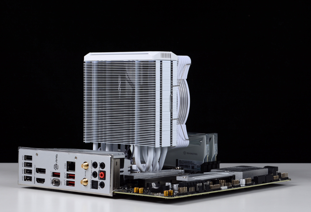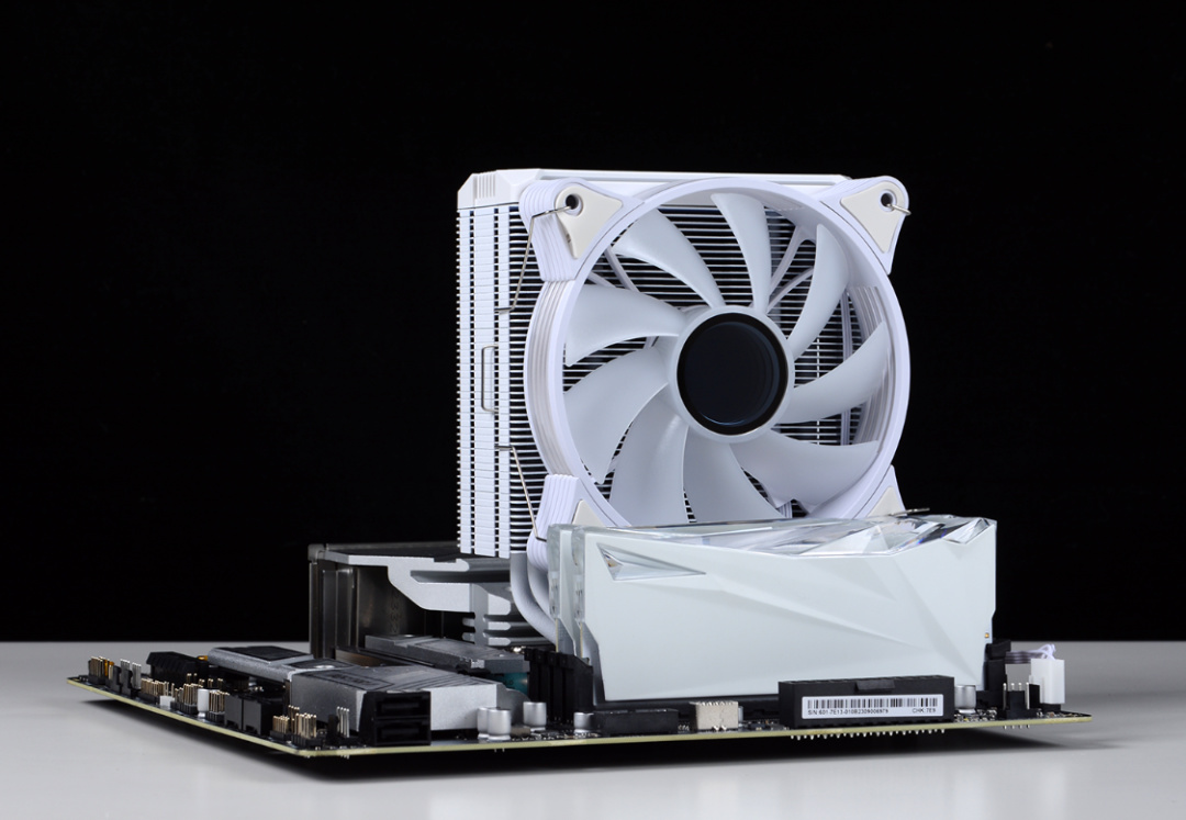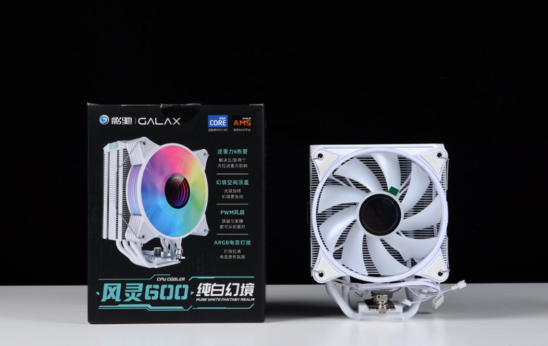 散熱方面,綜合機箱安裝環境和13600K散熱需求,選中的是這款白色的影馳風靈600幻境風冷。6根高導熱純銅鍍鎳熱管,熱管直觸設計,搭配49片鋁製鰭片,可以帶來非常優秀的解熱能力。頂蓋及風扇軸心採用的ARGB千層幻鏡燈效設計,搭配ARGB風扇,顏值表現也非常優秀。