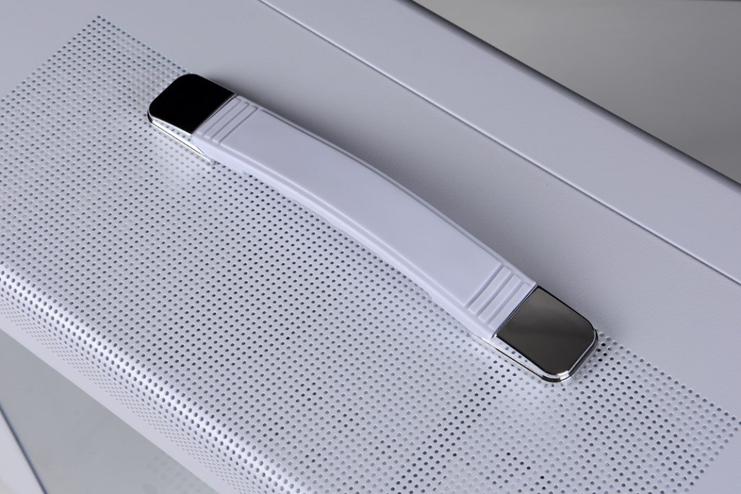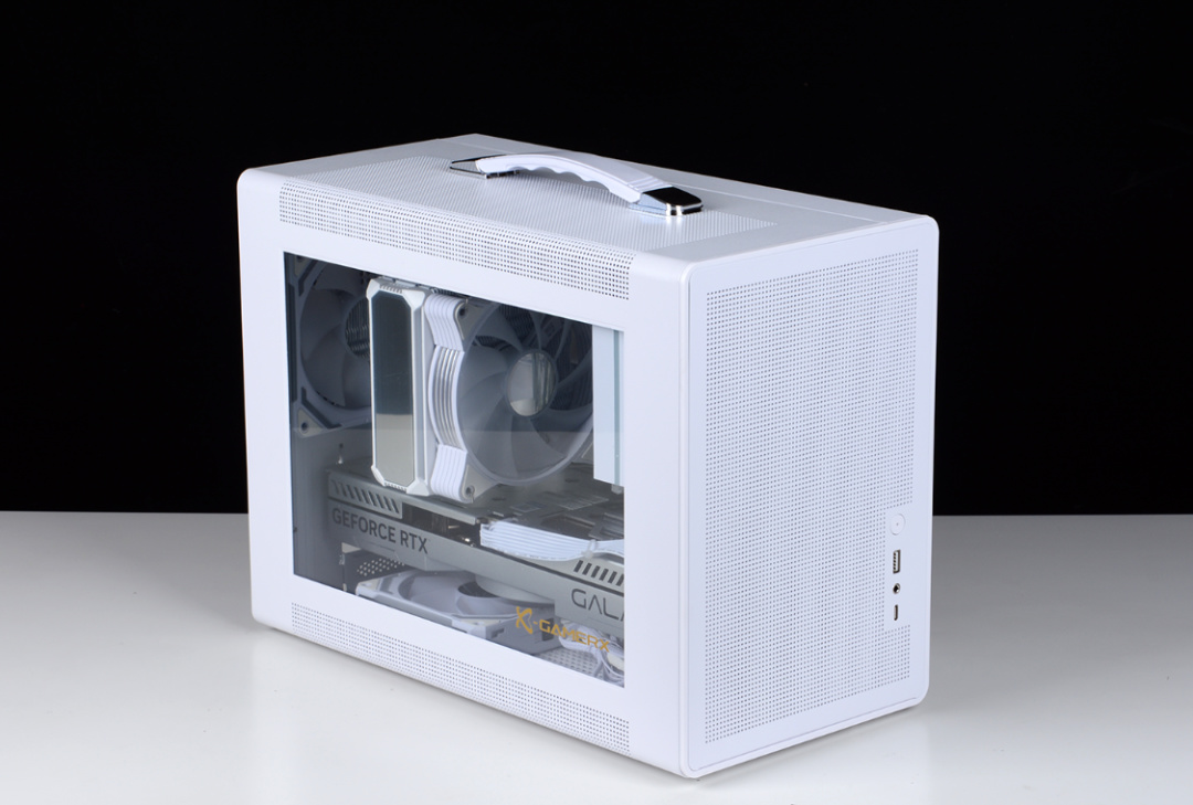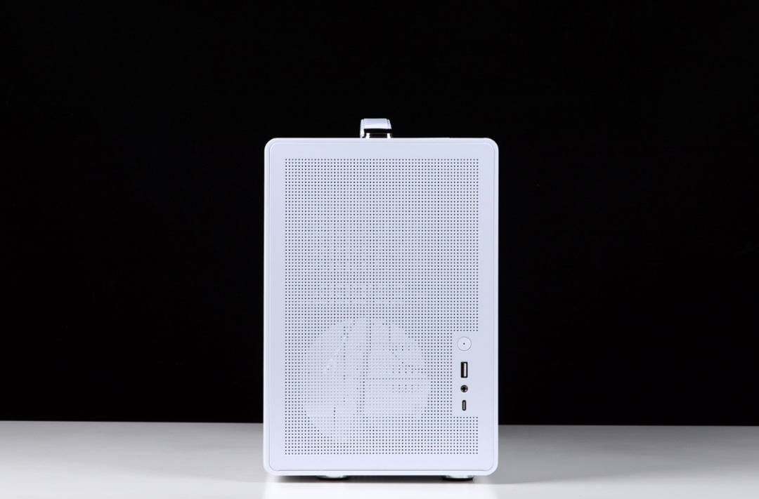 機箱前臉採用簡潔的白色網孔面板(卡扣設計),右下側是機箱IO面板,含:開機鍵+ USB3.0 +音頻口+Type-C接口。