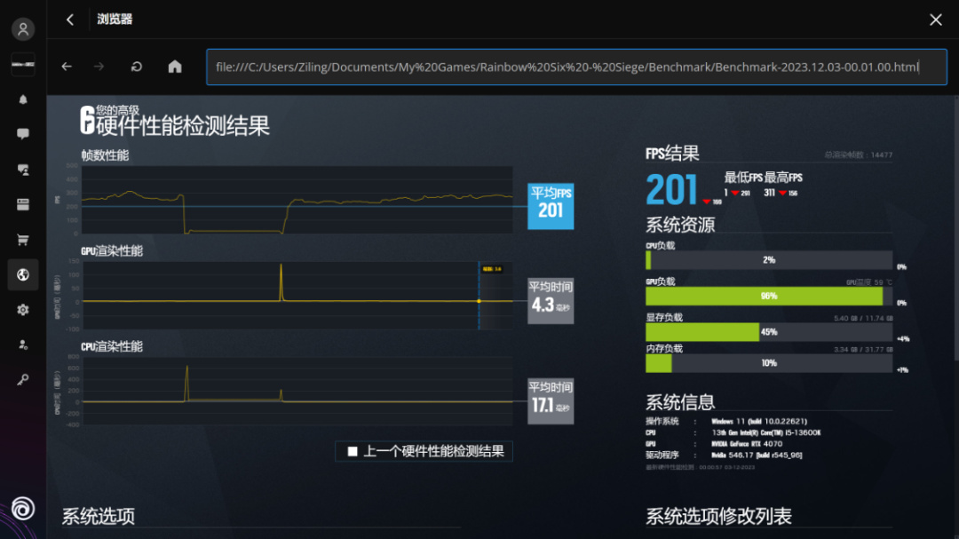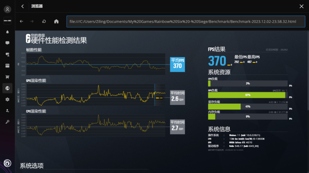 《彩虹六號》基準測試,畫質超高,渲染倍率設爲50/100,2K分辨率下,遊戲平均幀率爲370/201FPS;