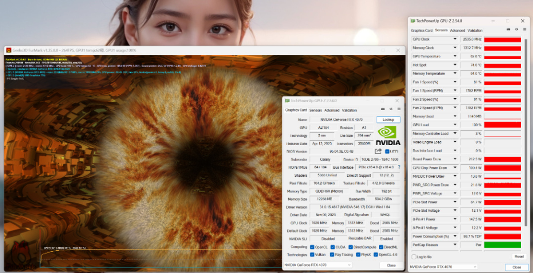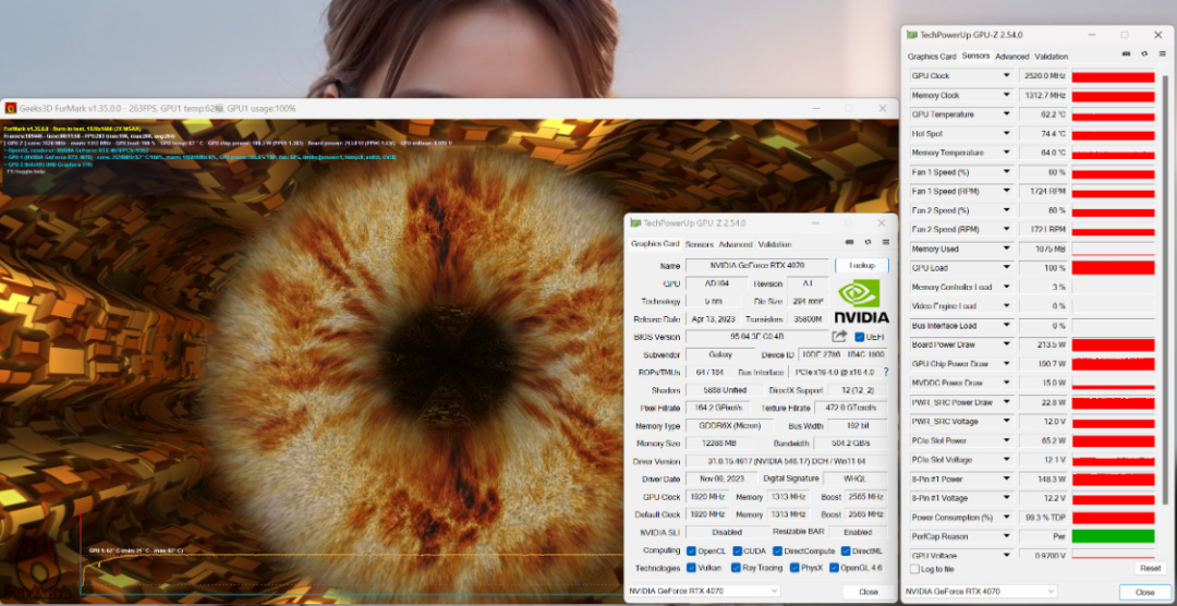 Furmark烤機測試,顯卡溫度62°左右(開關側板溫度差僅1°),顯卡功耗215W左右;