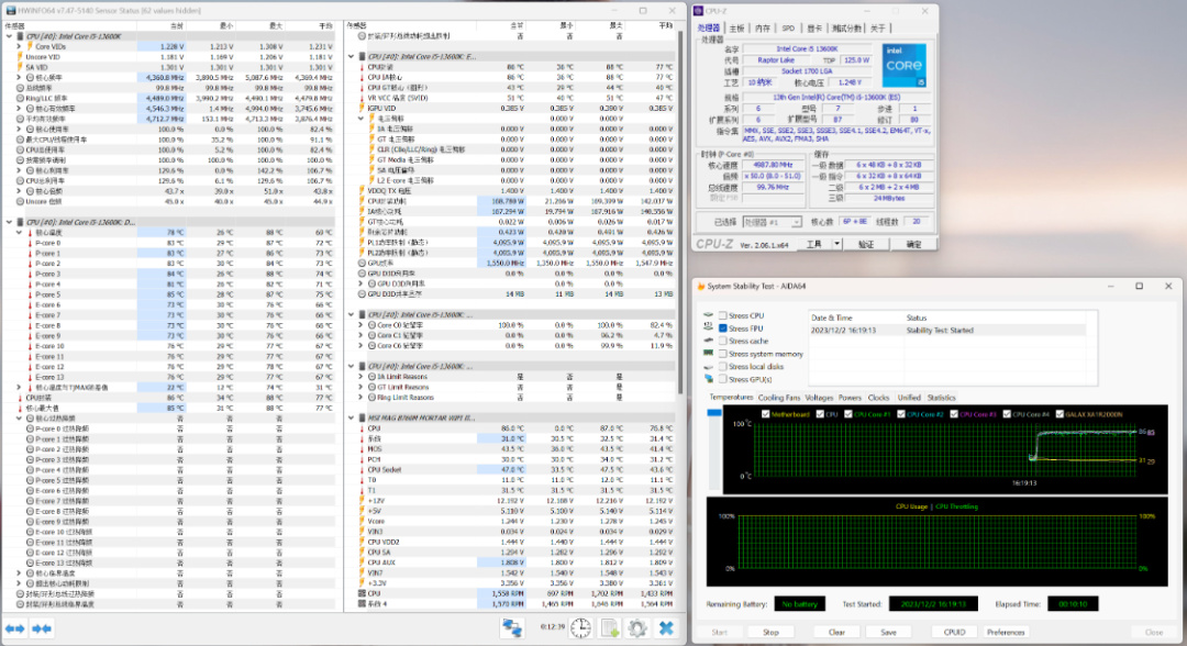 室溫26°,單烤FPU烤機測試,側板開啓狀態,CPU溫度在86°左右,功耗168W左右;側板關閉,CPU溫度在91°左右,功耗也保持在160W+。