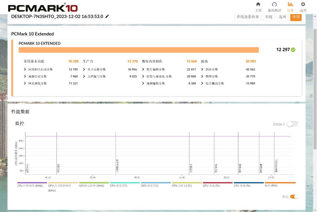 PC Mark Extended整機測試,整機得分12297分,常用基本功能得分10289分,生產力得分12370分,數爲內容創作得分15664分,遊戲得分30993分;