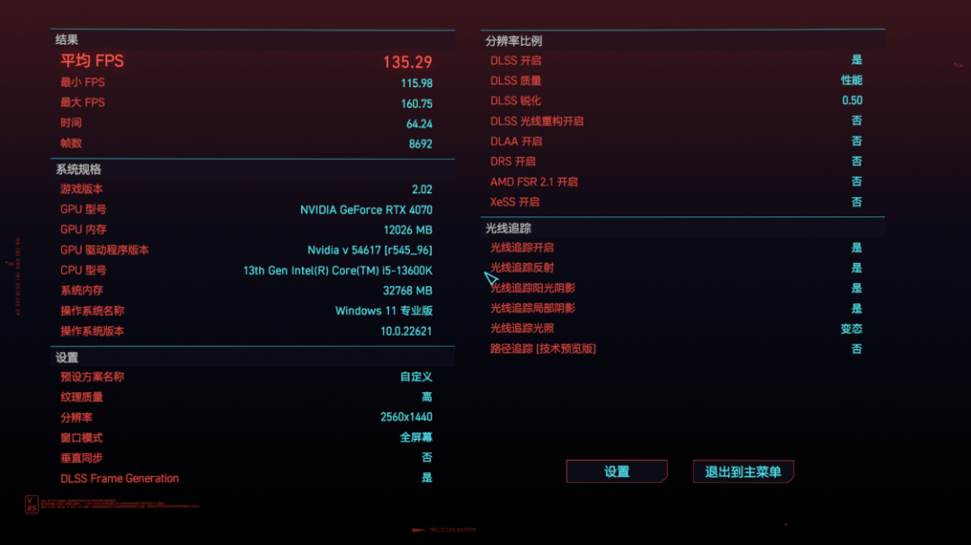 《賽博朋克2077》基準測試,畫質超級,光追超級,DLSS設爲超級性能模式/性能模式,並開啓DLSS 3.0,2K分辨率下,遊戲平均幀率爲177.14/135.29FPS;
