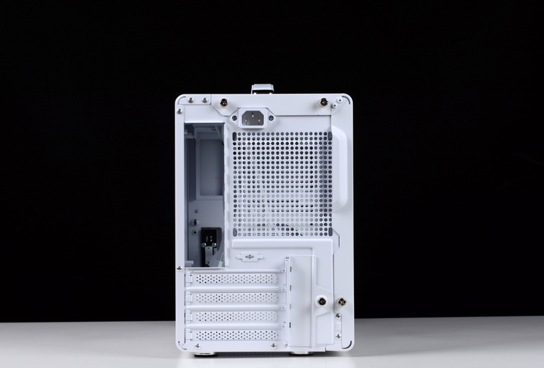 機箱尾部,充足的開孔,搭配散熱風扇有利於機箱內熱量的排出。4條橫置pcie顯卡插槽,也能更好地適配RTX40系顯卡的安裝。