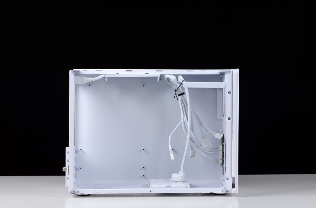 卸下側板,內部設計也非常簡潔,兼容M-ATX和ITX兩種規格主板,風冷限高168mm,最大支持4把120mm風扇(前+頂+後+底各1),可安裝ATX電源和SFX電源。顯卡方面,前板鎖風扇時顯卡限長335mm,不鎖風扇時限長350mm。此外,機箱底部至多支持1個3.5寸HDD硬盤和2個2.5英寸SSD固態拓展。機箱背側,不可拆,所以對於裝機來講,具備一定挑戰性。