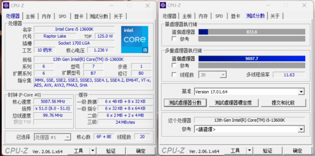 CPU-Z測試,13600K單核得分833.6,多核得分9697.7,表現也算正常。