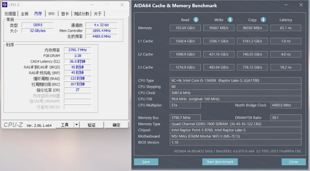 內存頻率拉到7600MHz,讀取速度爲105.69GB/s,寫入速度爲95661MB/s,複製速度爲96592MB/s,延時爲65.1ns;