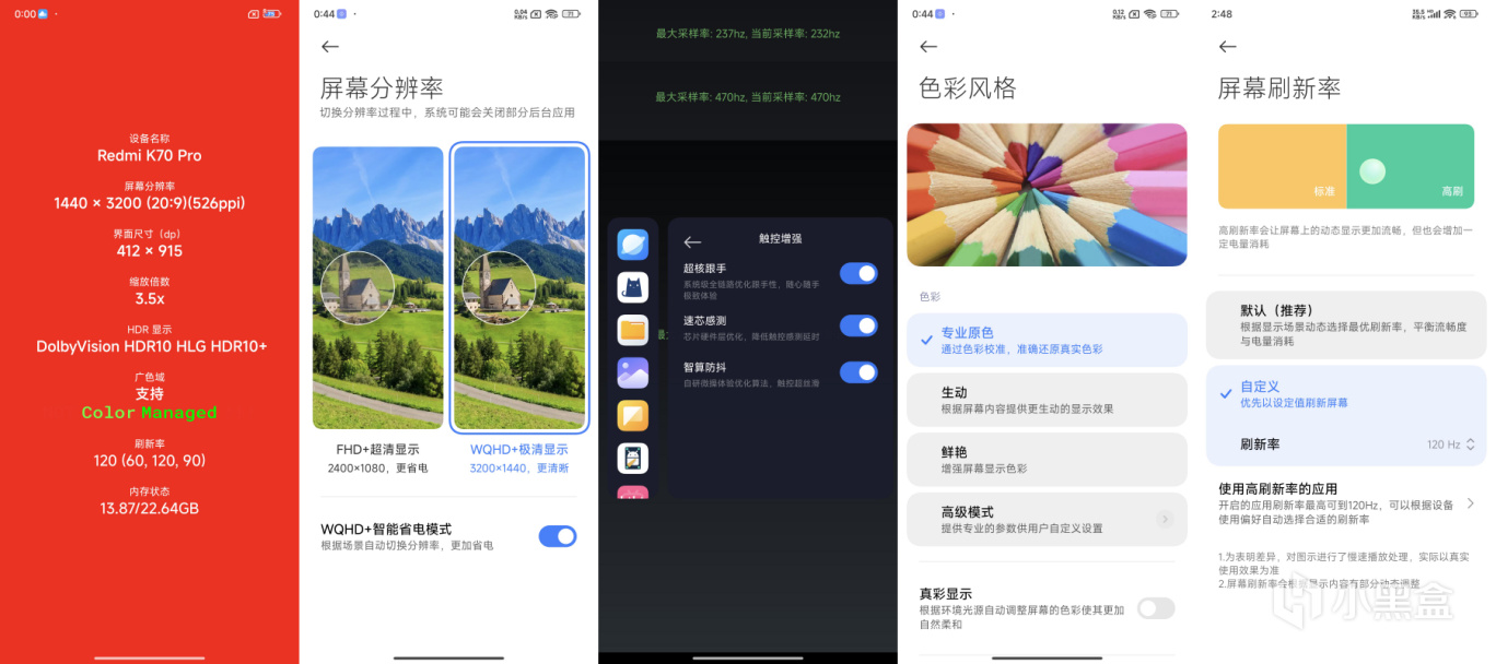 刷新率最高120Hz,提供默認和自定義(60Hz / 120Hz)模式可選,可自定義高刷應用。軟件接口讀出支持60Hz / 90Hz / 120Hz三檔。在屏幕靜止一段時間後會自動降60Hz。