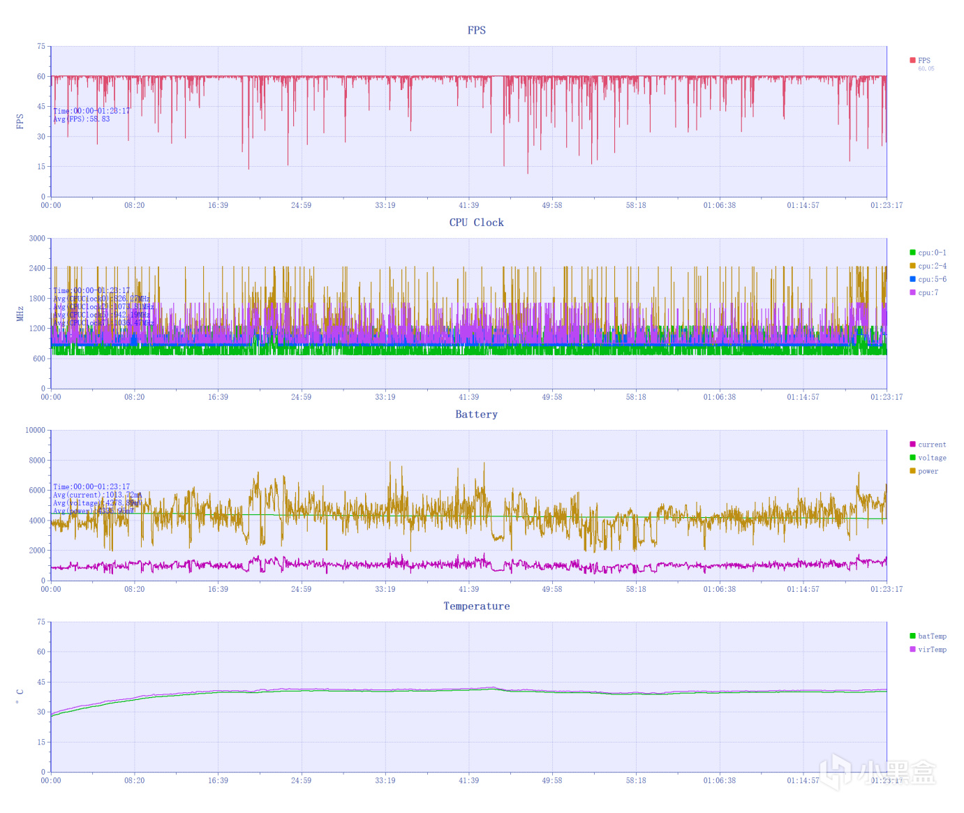 換上新晉“跑分軟件”——崩壞:星穹鐵道,全高畫質60幀,壓力拉到83分鐘,這麼大壓力下平均幀率58.83,平均功耗4.3W,15分鐘後溫度一直維持在40度上下。