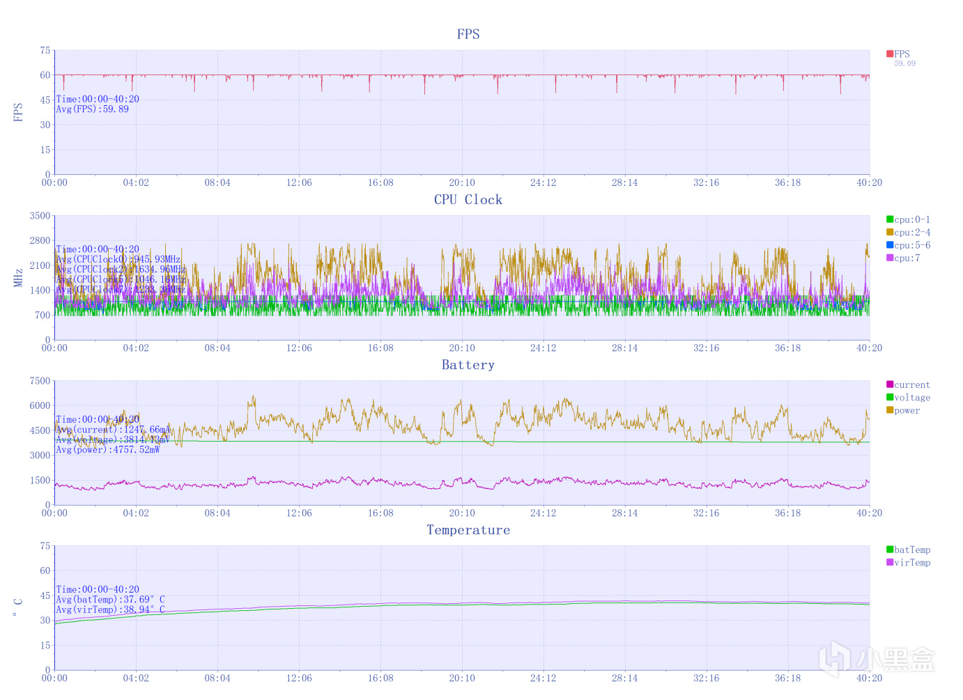 而到了Redmi K70 Pro上的第三代驍龍8,40分鐘全高畫質是輕輕鬆鬆穩住,平均幀率59.89,平均功耗僅4.7W,最高溫度僅僅40°C上下。