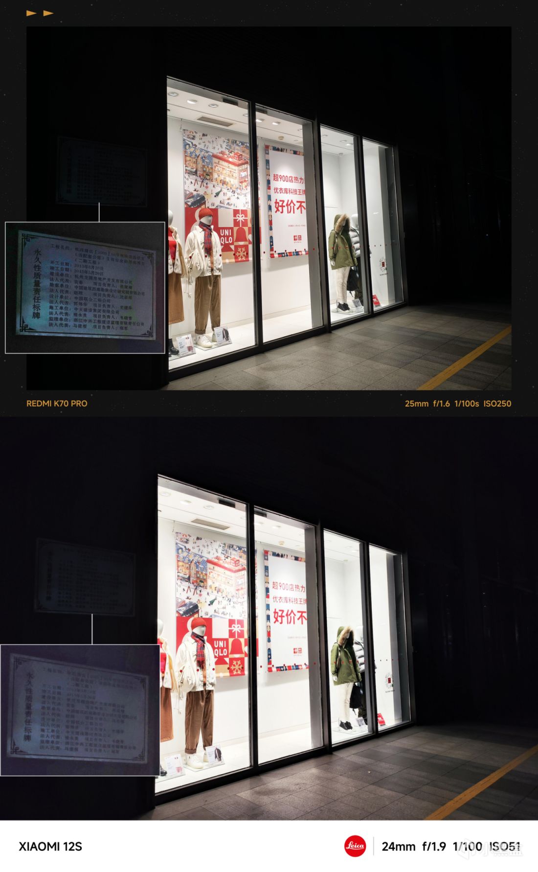 在這組對比中,K70 Pro同樣把櫥窗外暗部壓得更暗,櫥窗內的白色光線做到了精準還原不過曝;小米12S櫥窗內已經存在大面積過曝了。