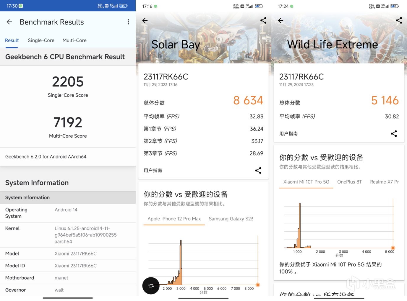 在Geekbench 6.2.0測試中,單核得分2205,多核得分7192,和小米14有來有回。