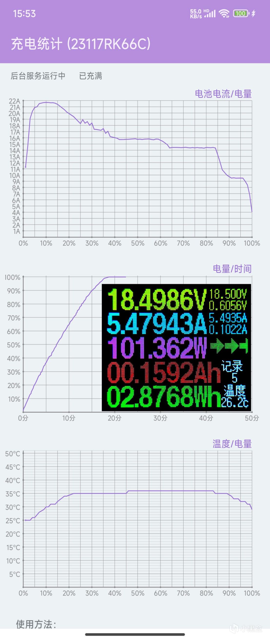 官方宣傳18分鐘充滿。實測從1%到100%用時18分鐘多一點點,峯值功率達101.4W左右。
