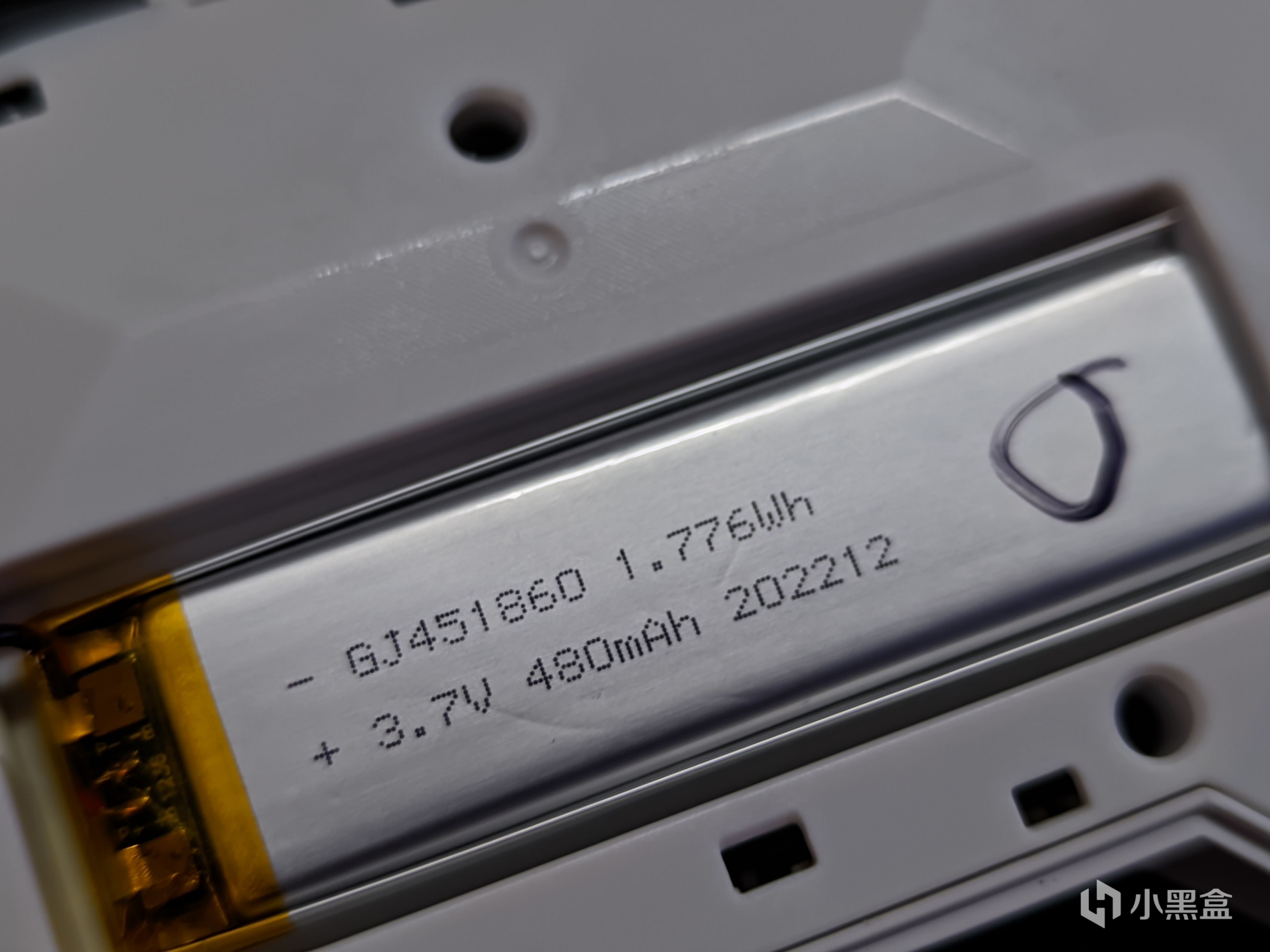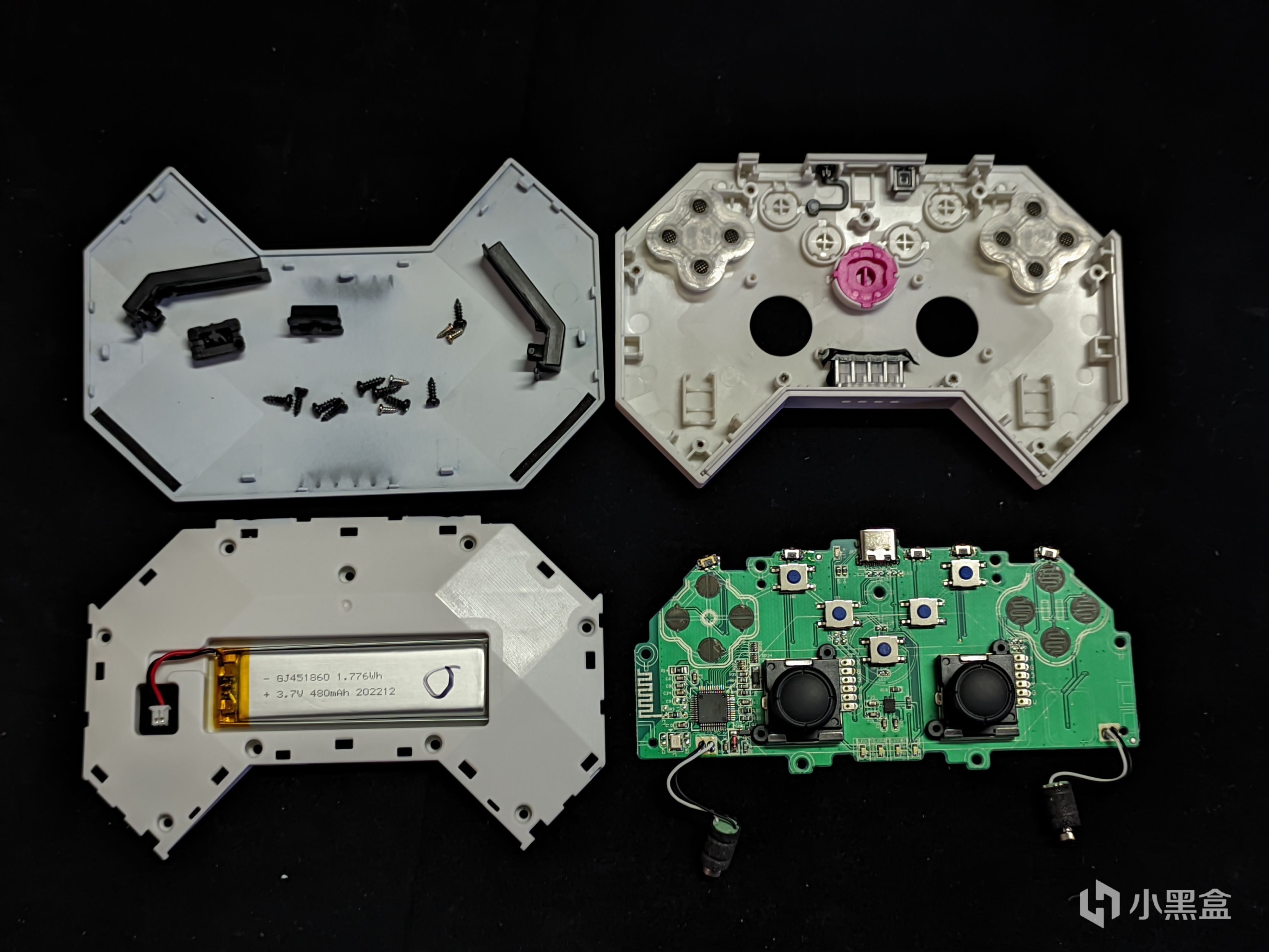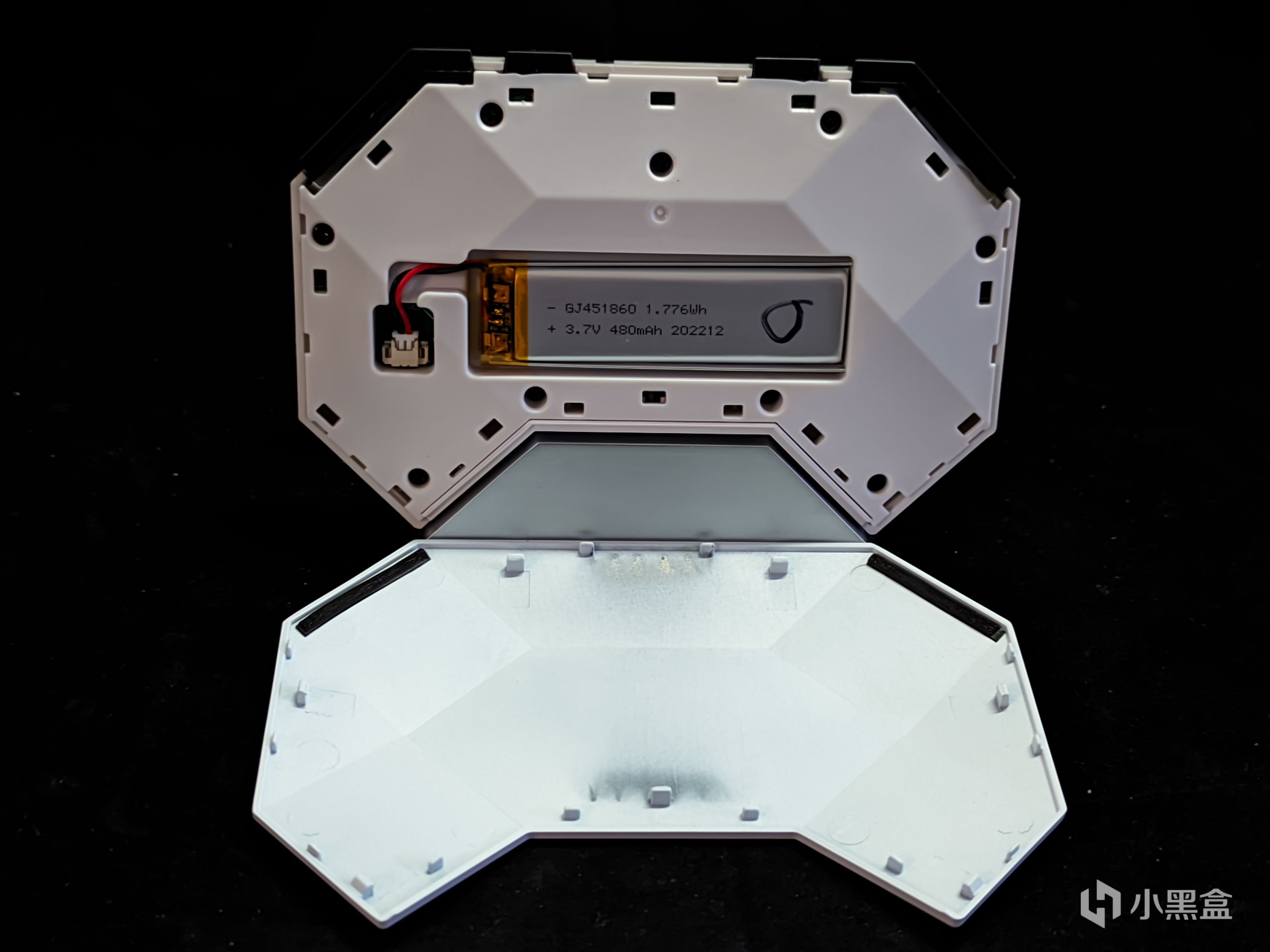 那翻都翻過來了,拆開看看唄~,沿着縫隙摳開卡扣,就可以將金屬底殼取下來了,首先看見的就是一塊480mAh的蓄電池,作爲一款無燈光設計的手柄,480mAh的電量還是很夠用的,然後就是九顆螺絲,取下電池排線,再拆下九顆螺絲,就可以取下這個遮蔽層了。