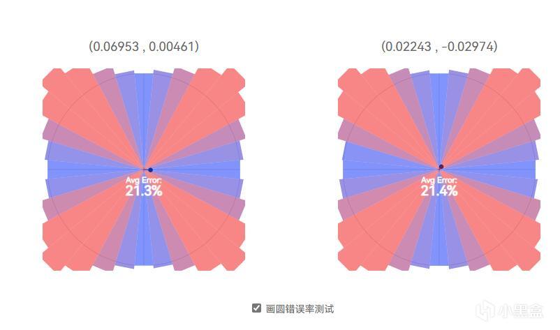 手柄本身採用的是方形調教,軌跡圖如上,順帶一提,錯誤率無需在意,因爲那是畫圓錯誤率,這個是方形調教,不是圓形調教,方形調教在對角線方向對於圓形調教更有優勢,而八角形調教則是爲了保證雙霍爾之間不會相互干擾所以纔出現的調教風格,當做方形調教就好。