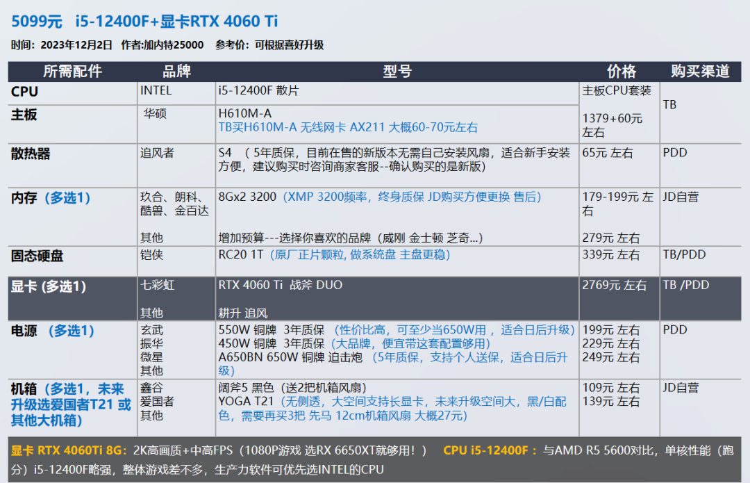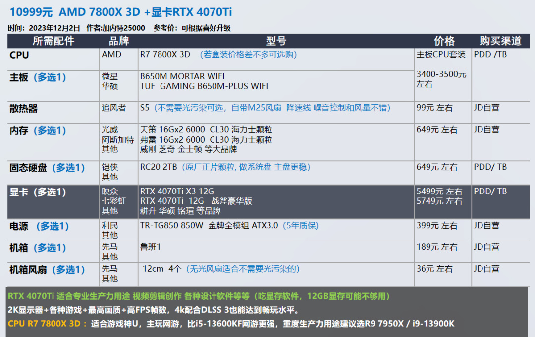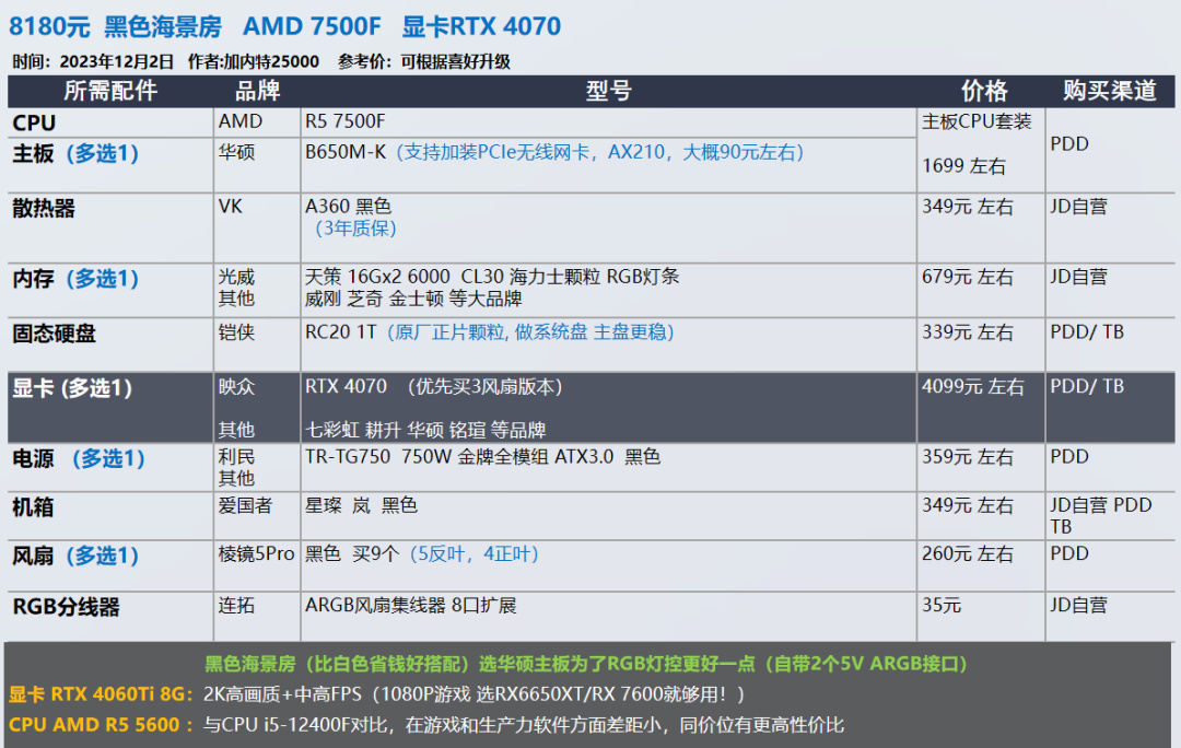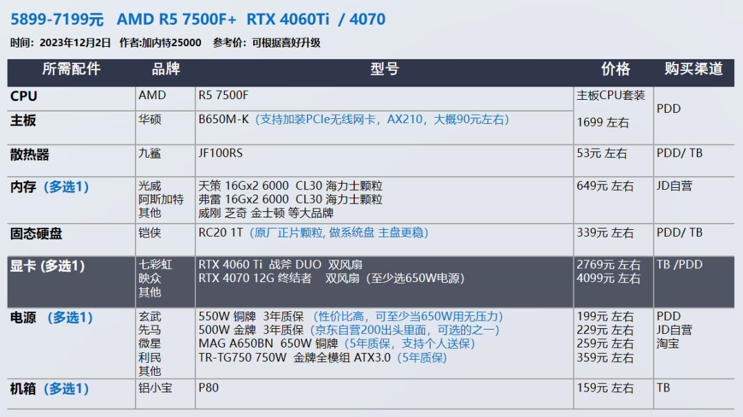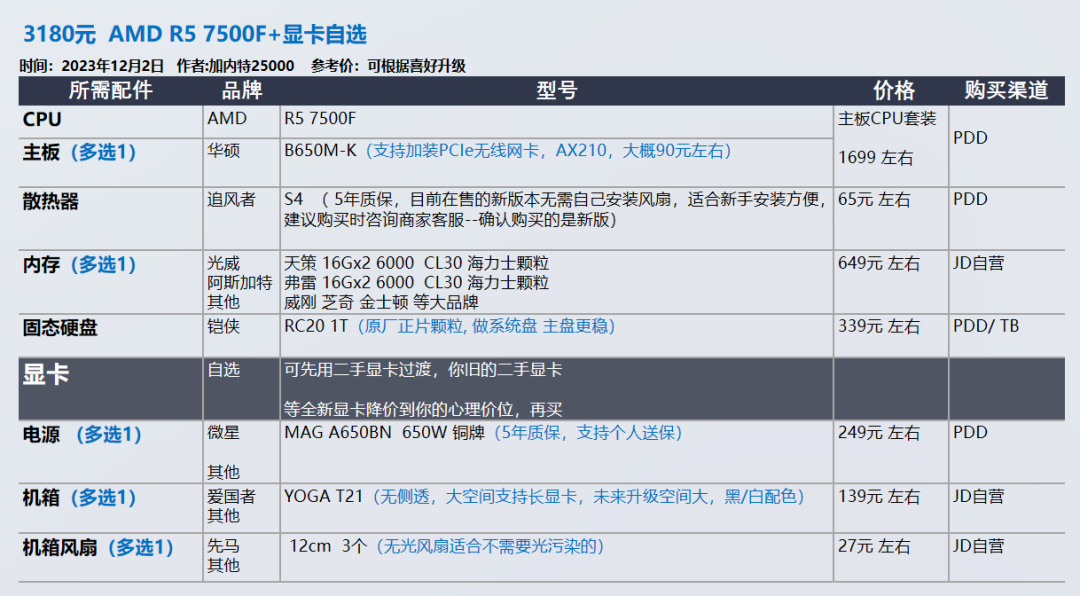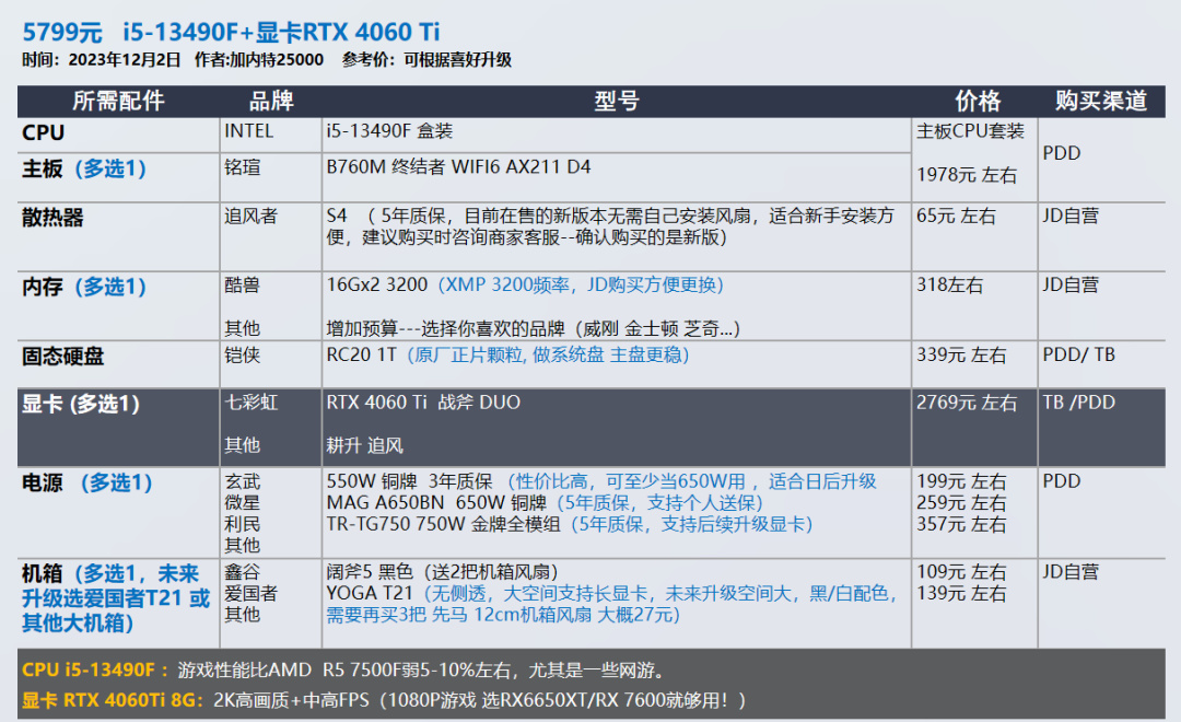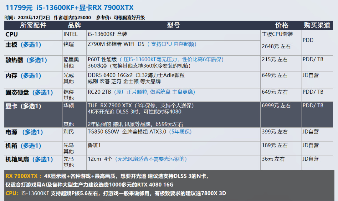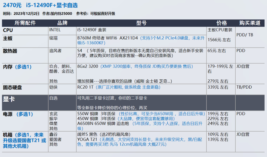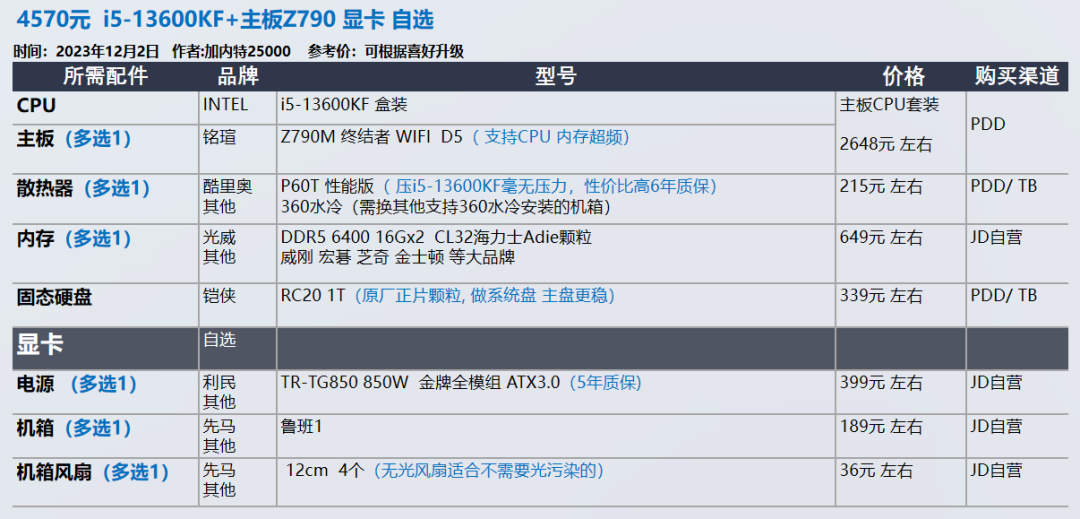 我的推荐以显卡和需求为导向,各位可以在我的推荐基础上进行升级,选择你喜欢的品牌配件,比如说好看的机箱 风扇。