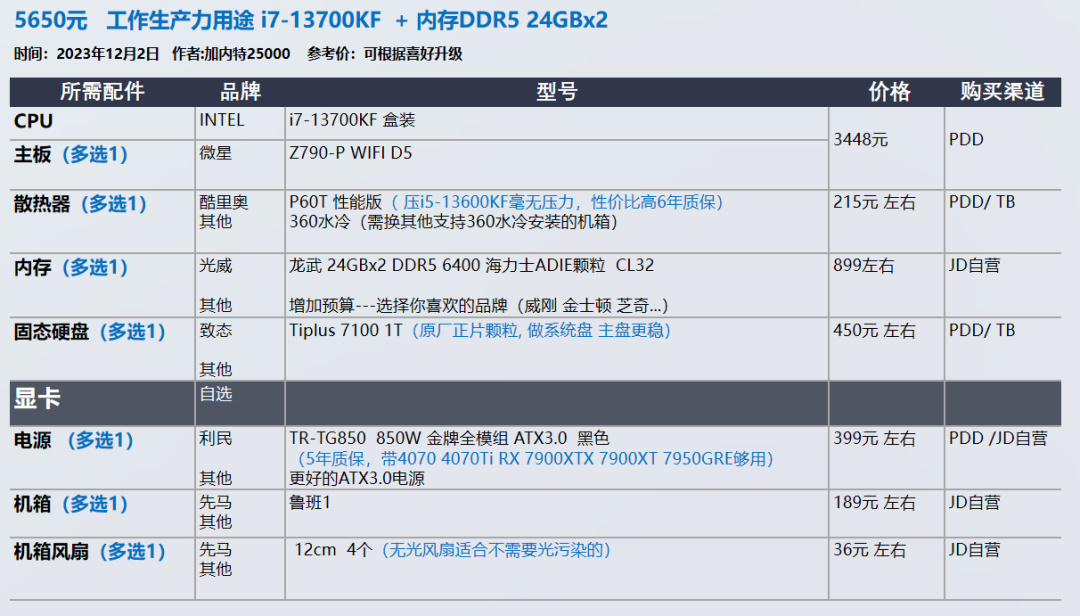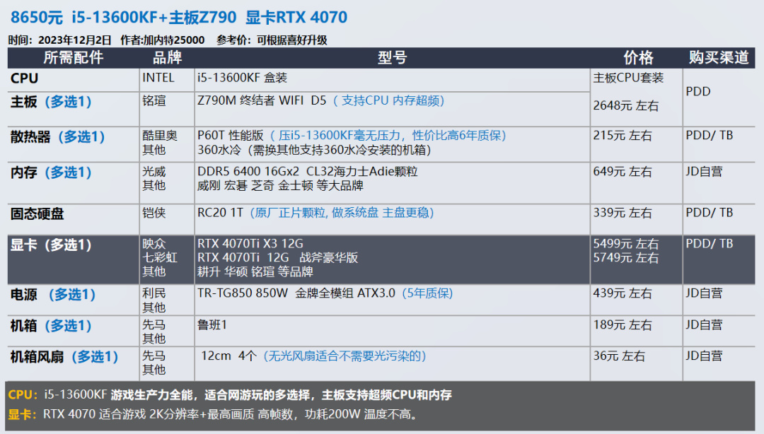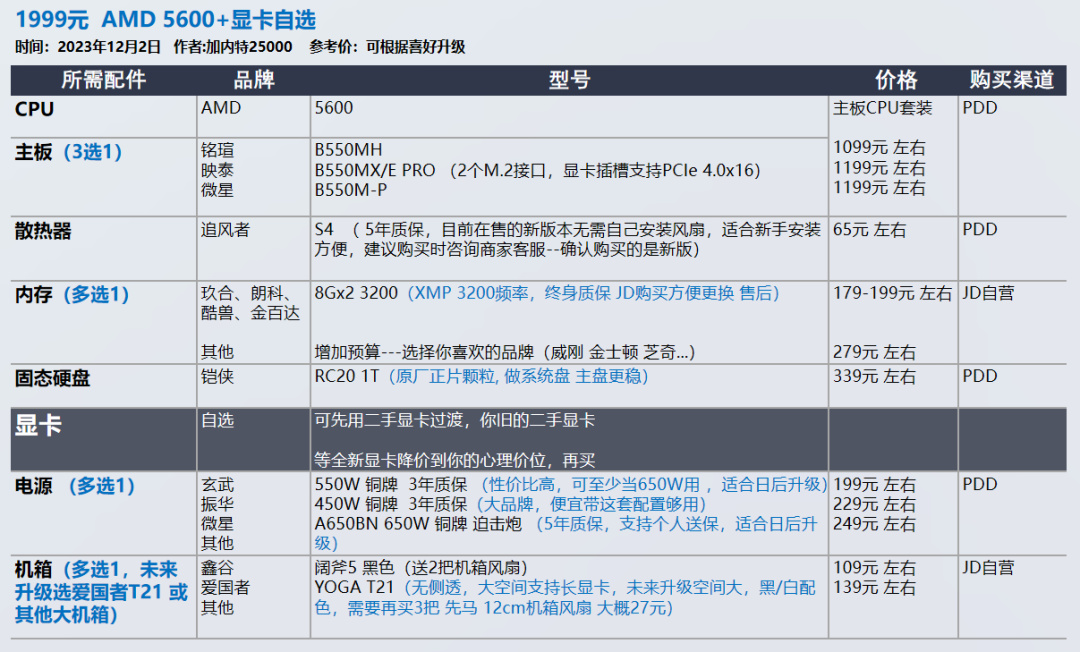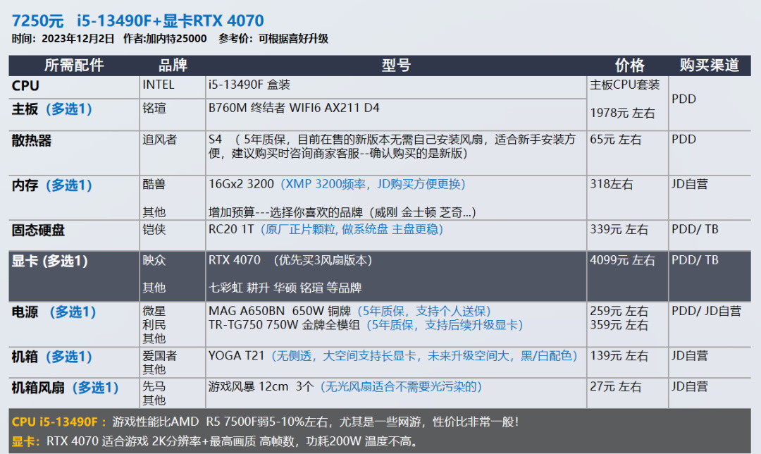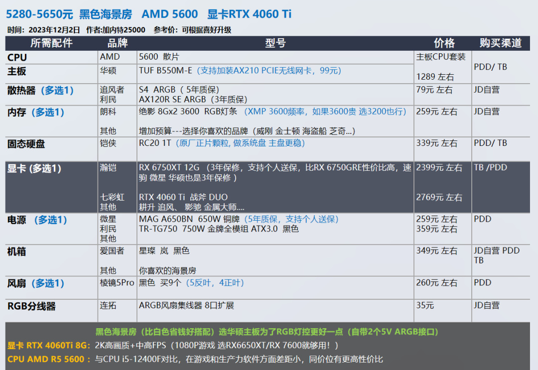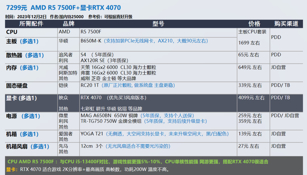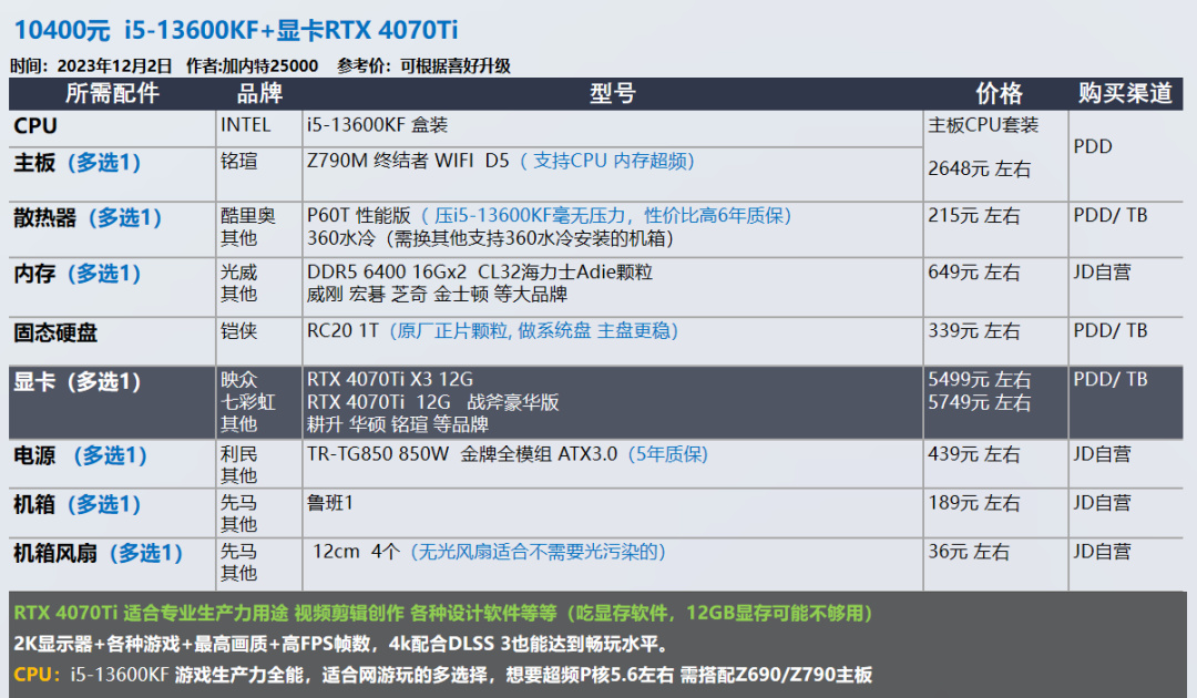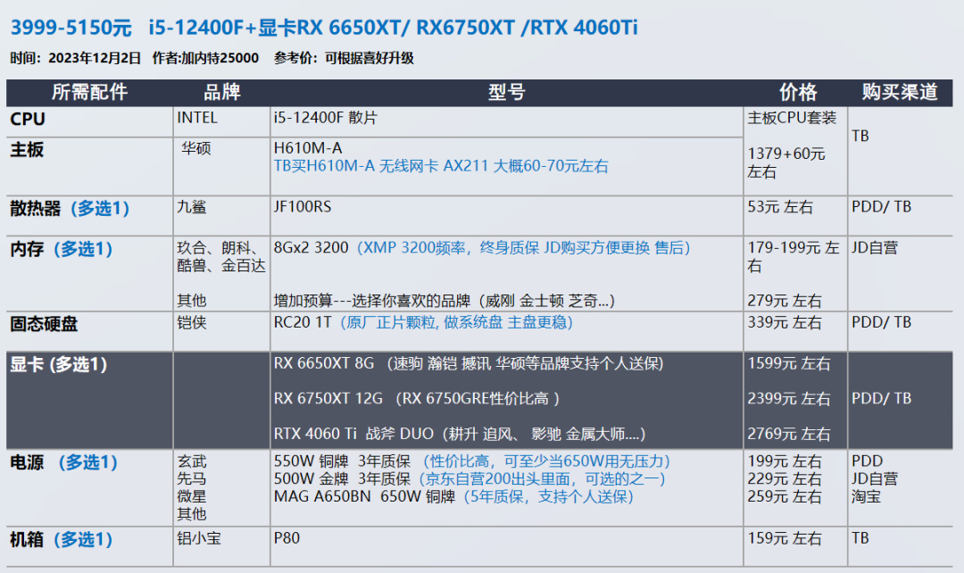 我的推荐以显卡和需求为导向,各位可以在我的推荐基础上进行升级,选择你喜欢的品牌配件,比如说好看的机箱 风扇。