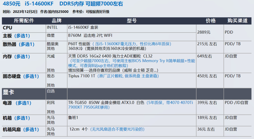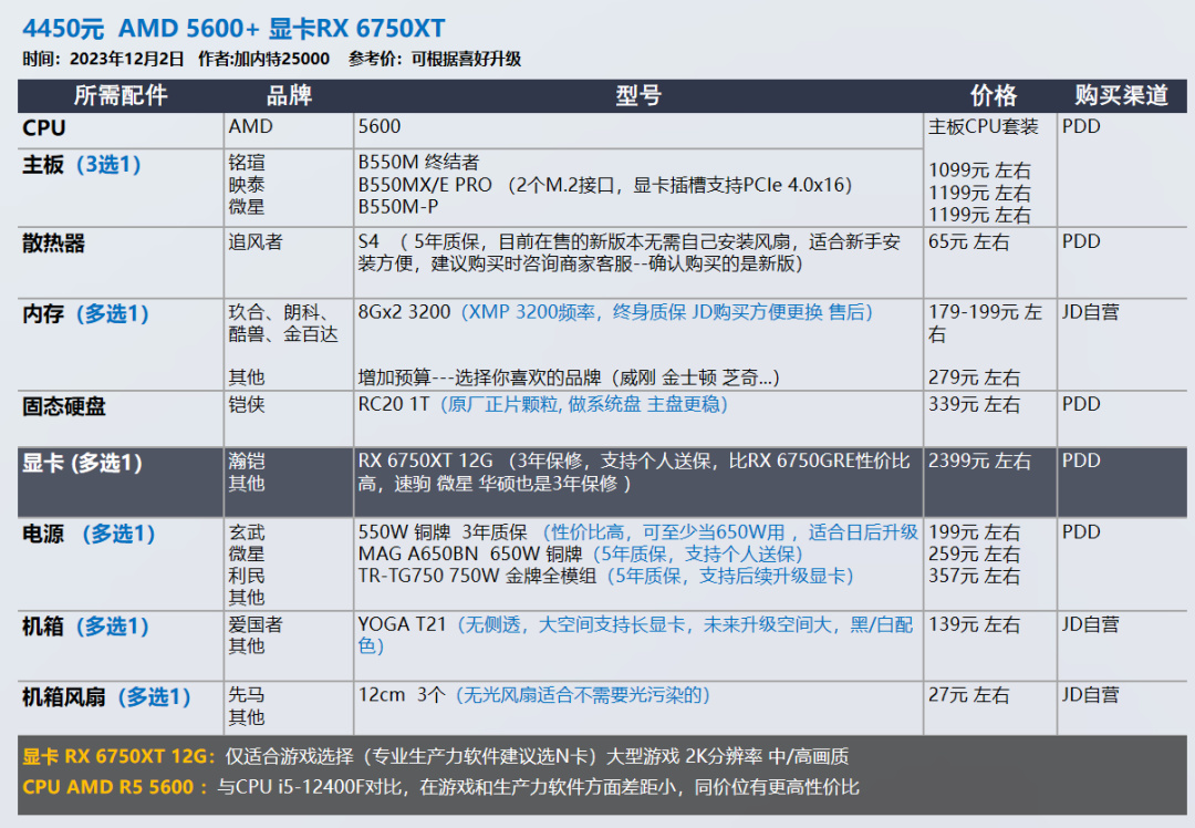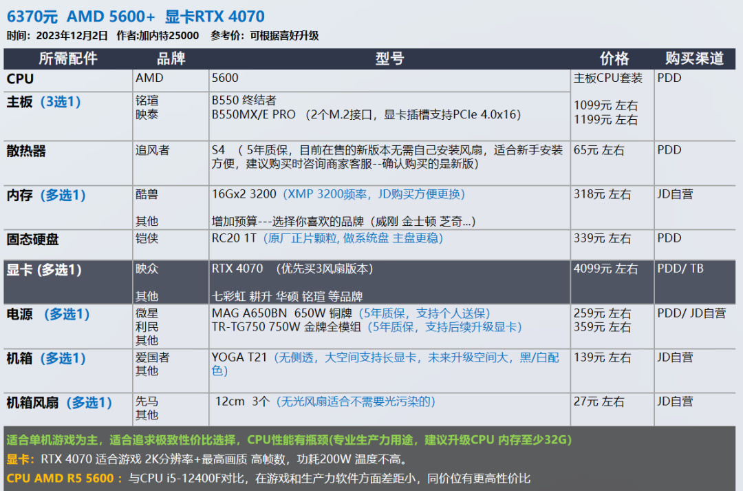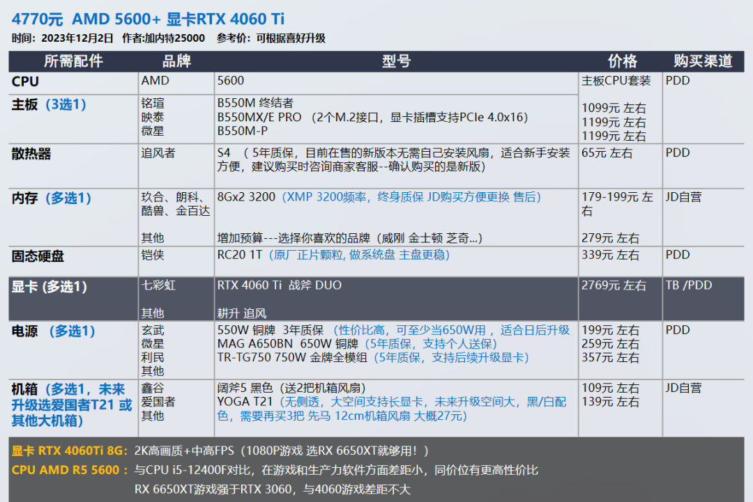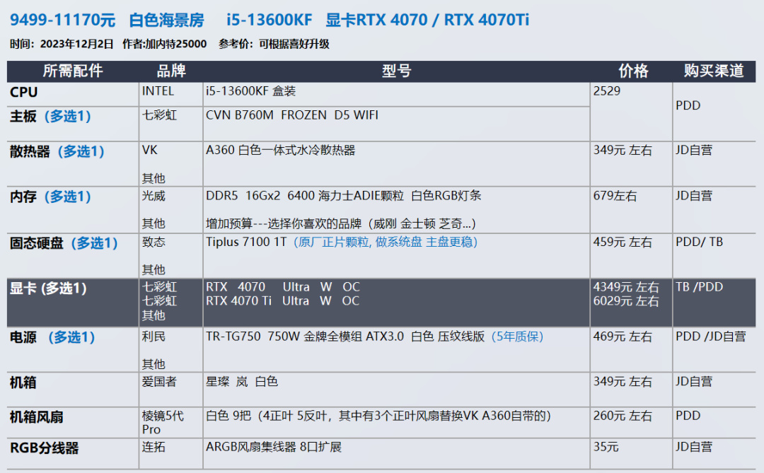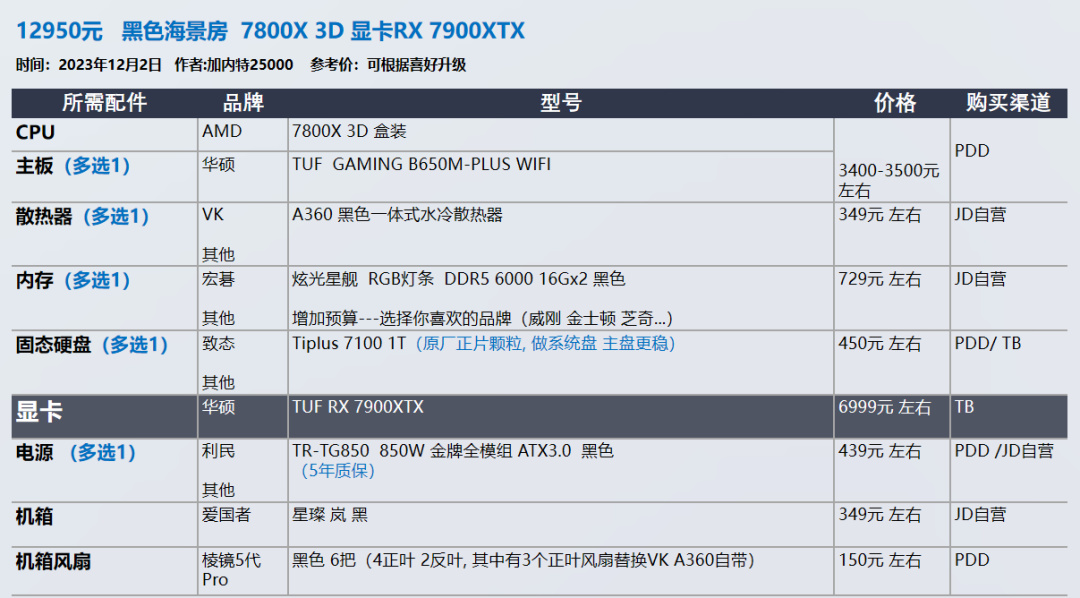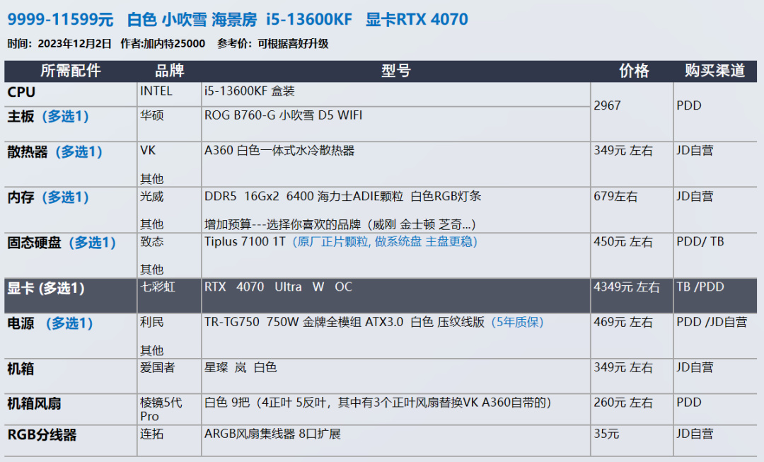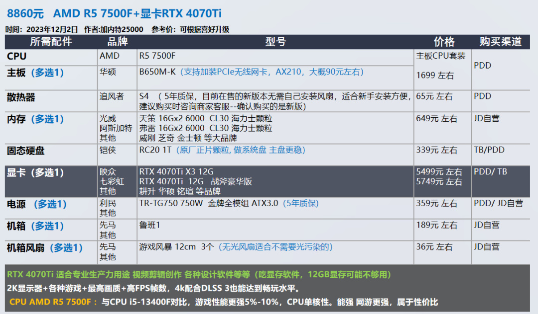 我的推荐以显卡和需求为导向,各位可以在我的推荐基础上进行升级,选择你喜欢的品牌配件,比如说好看的机箱 风扇。